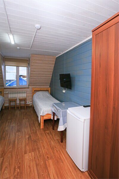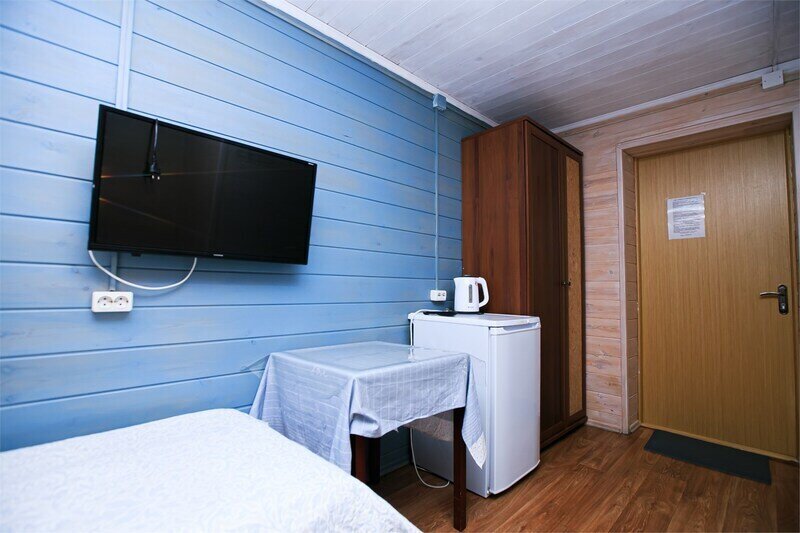 В номере две односпальные кровати, санузел c душем, холодильник, телевизор.