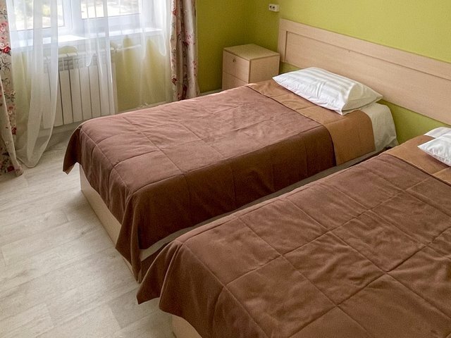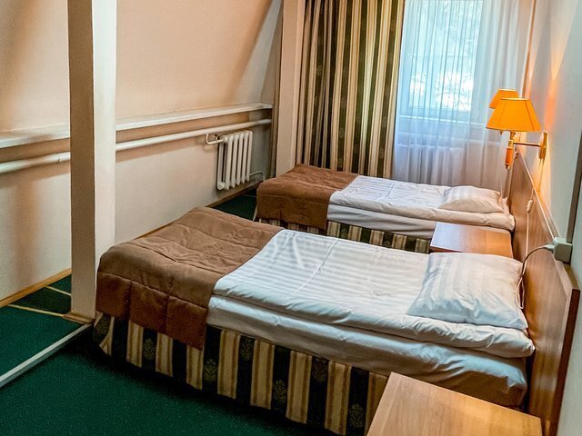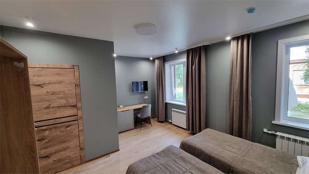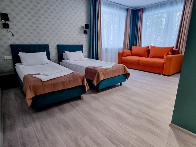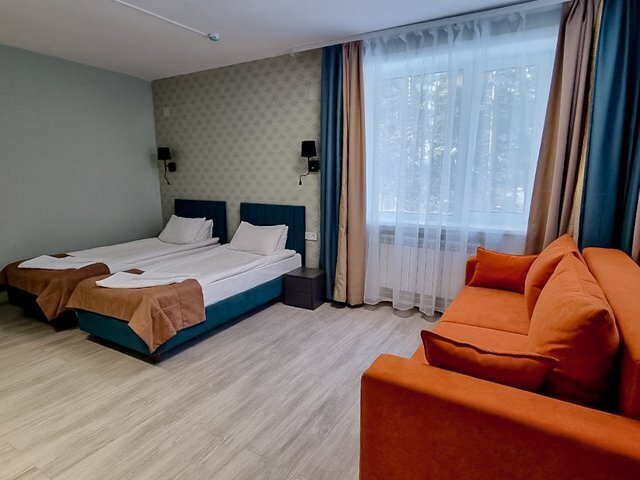 В номере: две односпальные кровати, раскладной диван. Вид из окна: на лес. Тип номера: TWIN (две односпальные кровати). Возможность установки детской кроватки: нет.