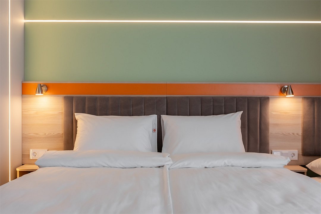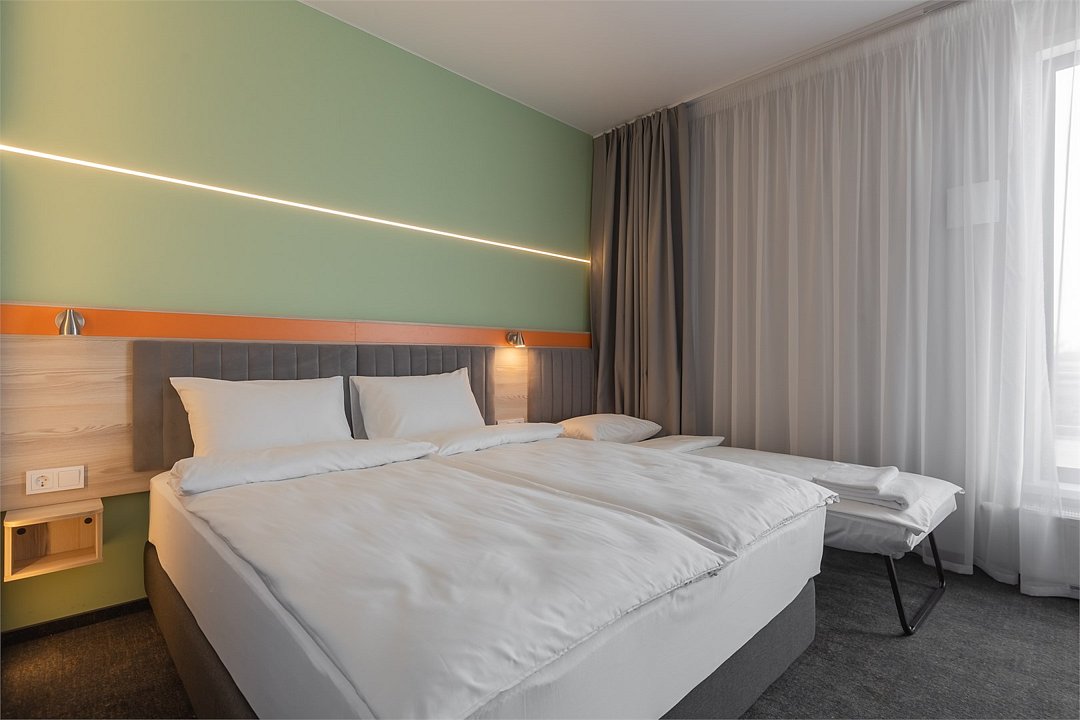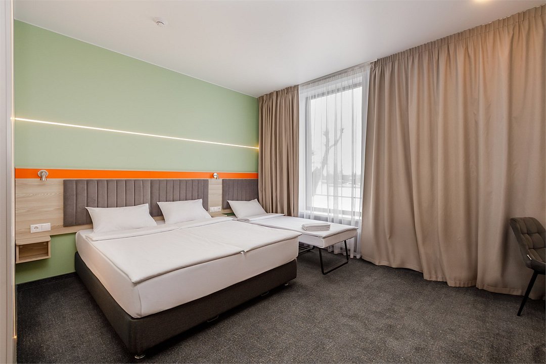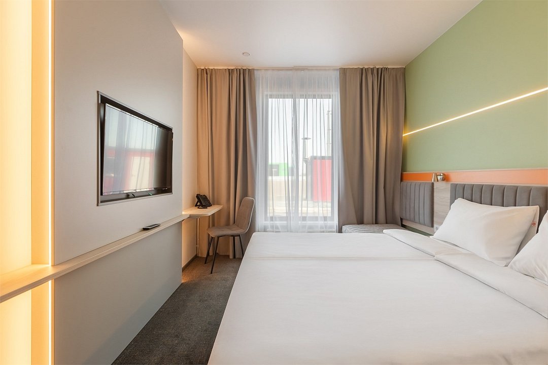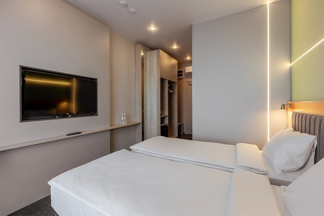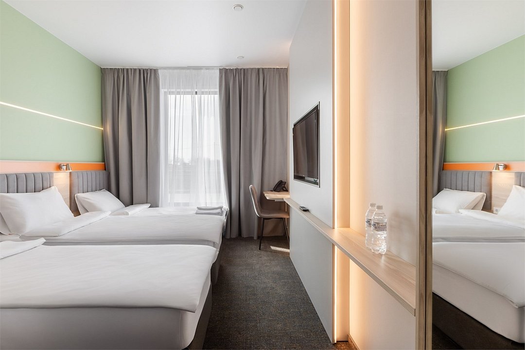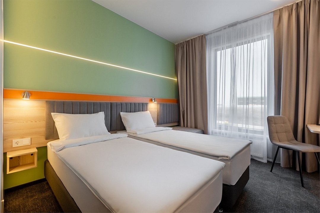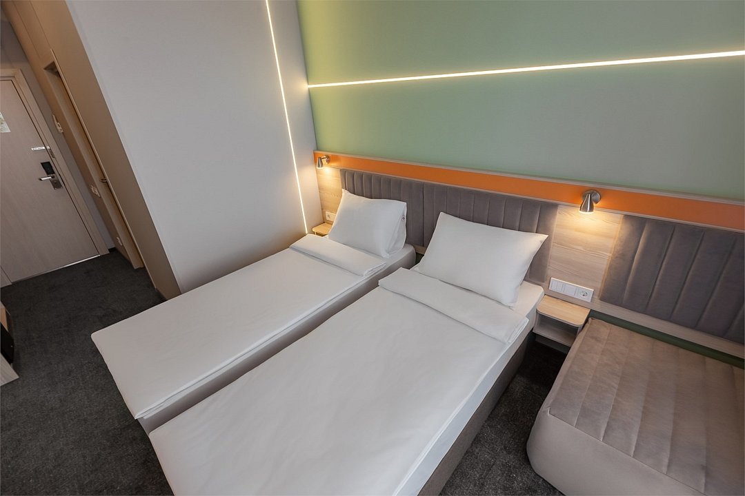 Номер площадью 18 м2 с 2 односпальными кроватями с анатомическим матрасом рассчитан на 2 взрослых и 1 ребенка. Для детей до 5 лет включительно проживание в одном номере со взрослыми предоставляется бесплатно на отдельном спальном месте. По запросу может быть предоставлена детская кроватка (для детей от 0 до 3 лет). В номере: Кровати с ортопедическими матрасами, телевизор, мини-бар, кондиционер, телефон. В собственной ванной комнате есть все необходимое для путешественников: набор полотенец, туалетно-косметические принадлежности, фен. Для комфортного отдыха в номерах используются светонепроницаемые шторы и улучшенная звукоизоляция. Доступ к высокоскоростному интернету и рабочий уголок позволяют оперативно и комфортно решать рабочие вопросы.Услуги и удобства