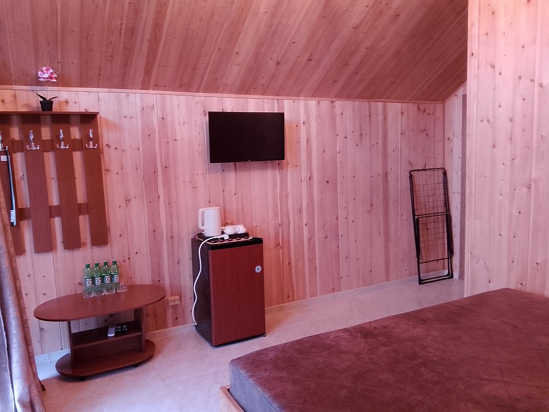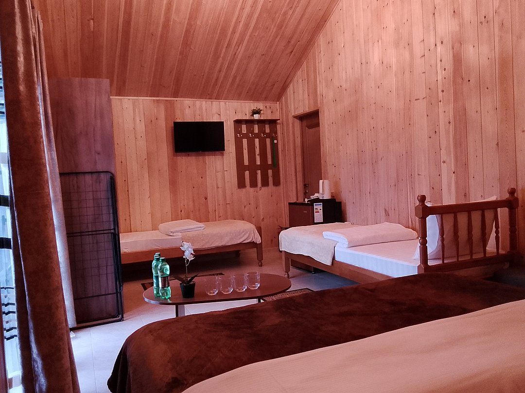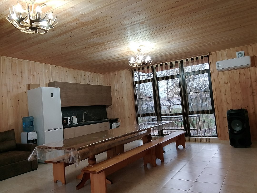 Для Вас, два 4х- местных двухкомнатных домика на первом этаже, и два 4х-местных номера на втором этаже, большой банкетный зал укомплектованный столовыми приборами на всех гостей, колонка с Bluetooth, мангальная зона и тёплый бассейн.