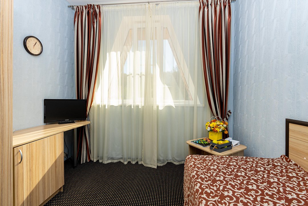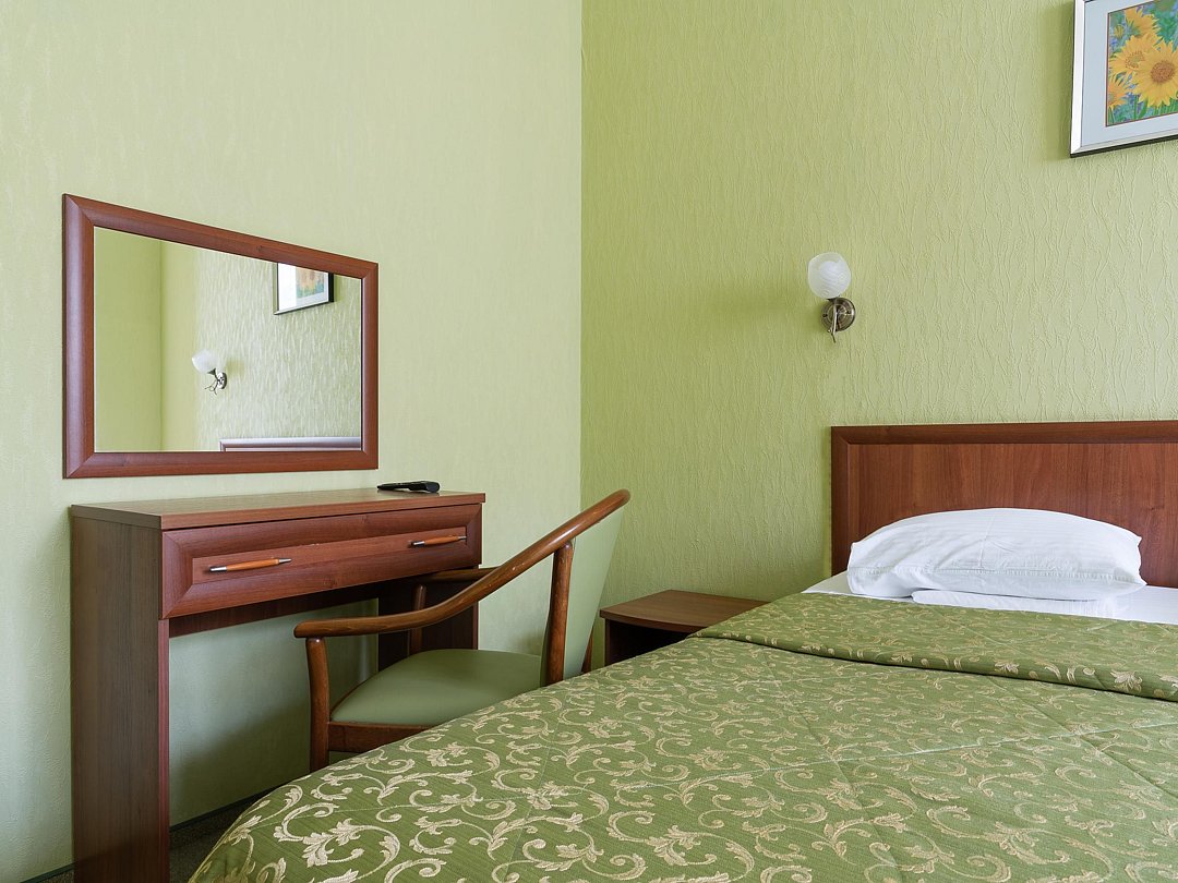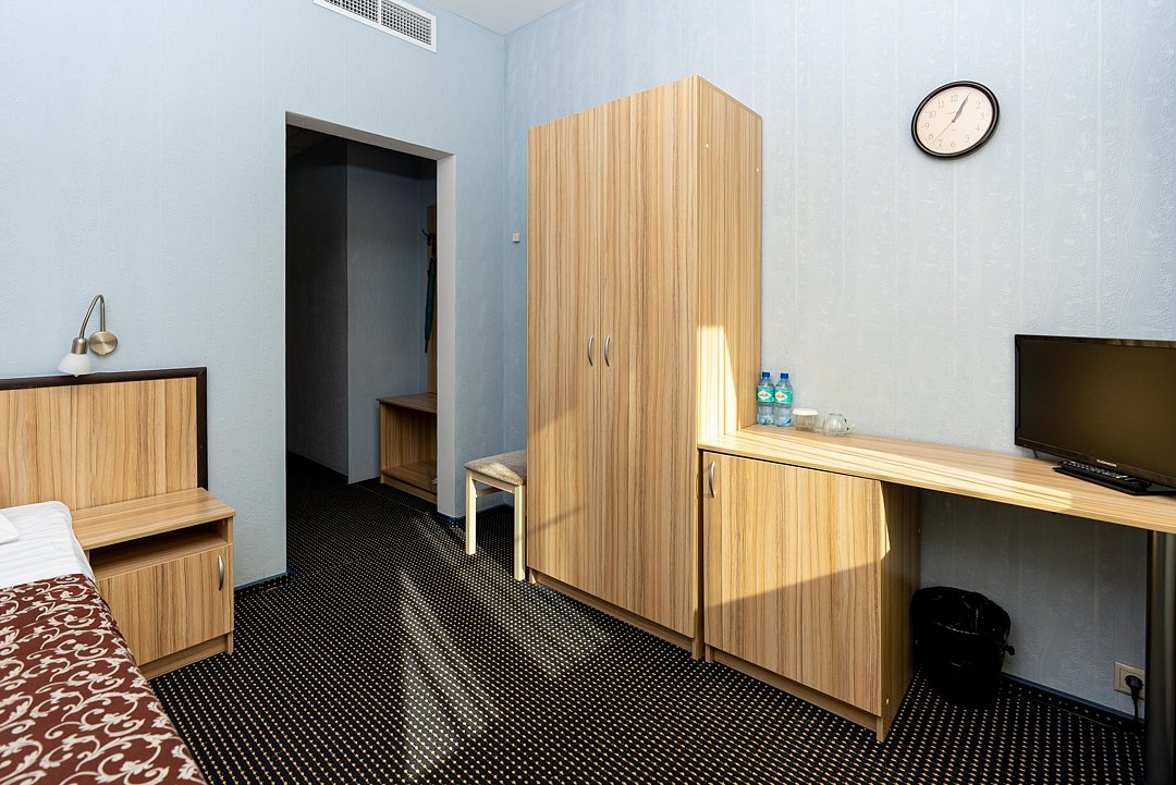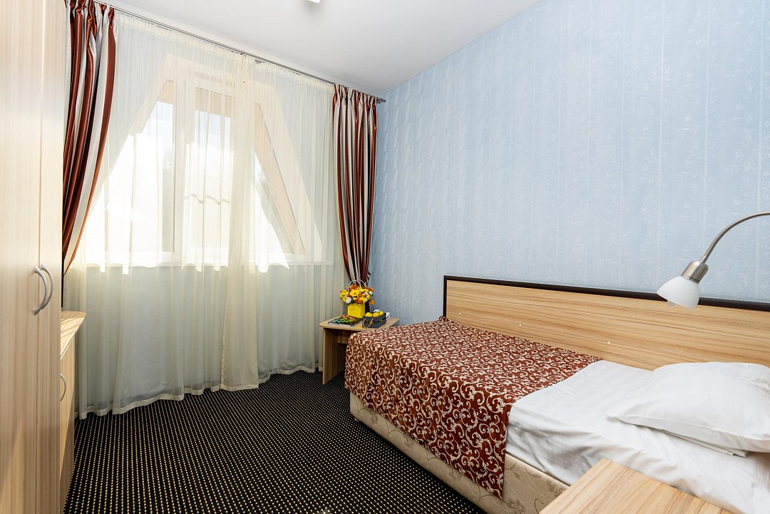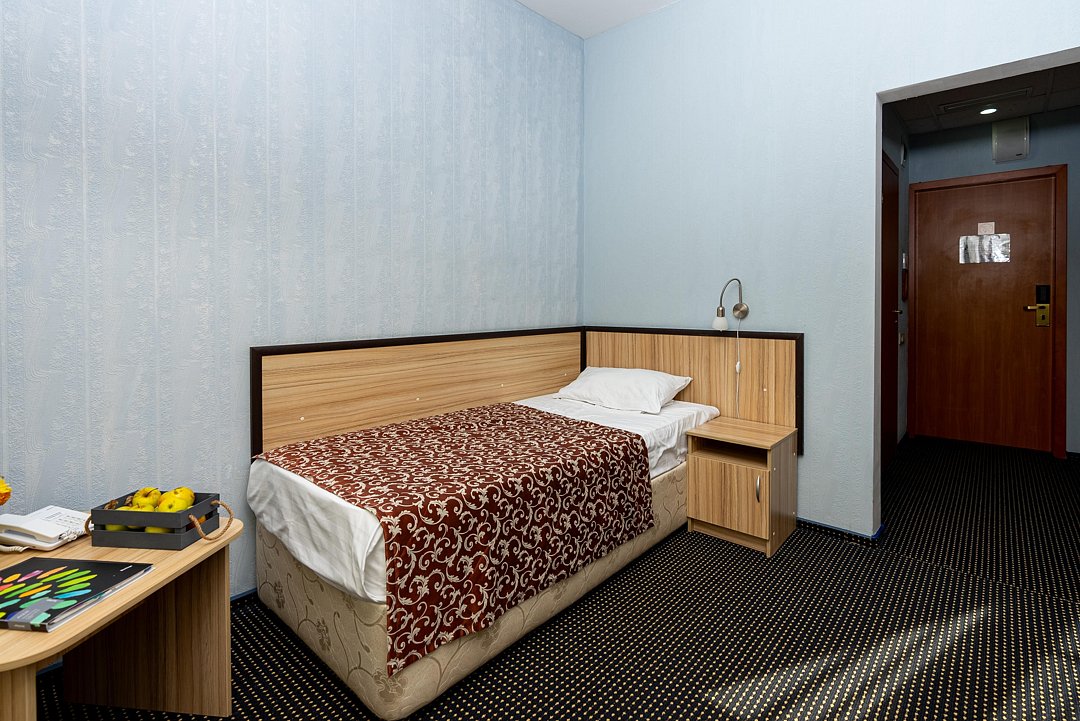 Компактный однокомнатный номер. В номере: кровать, прикроватная тумба, мини-бар, холодильник, цифровое ТВ, рабочий стол, зеркало, телефон, шкаф-гардероб, багажница, посуда, плотные шторы для затемнения.
