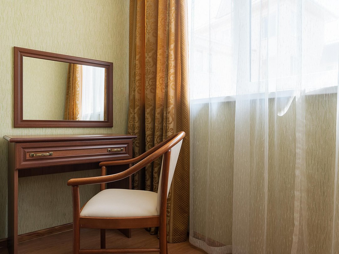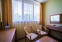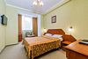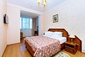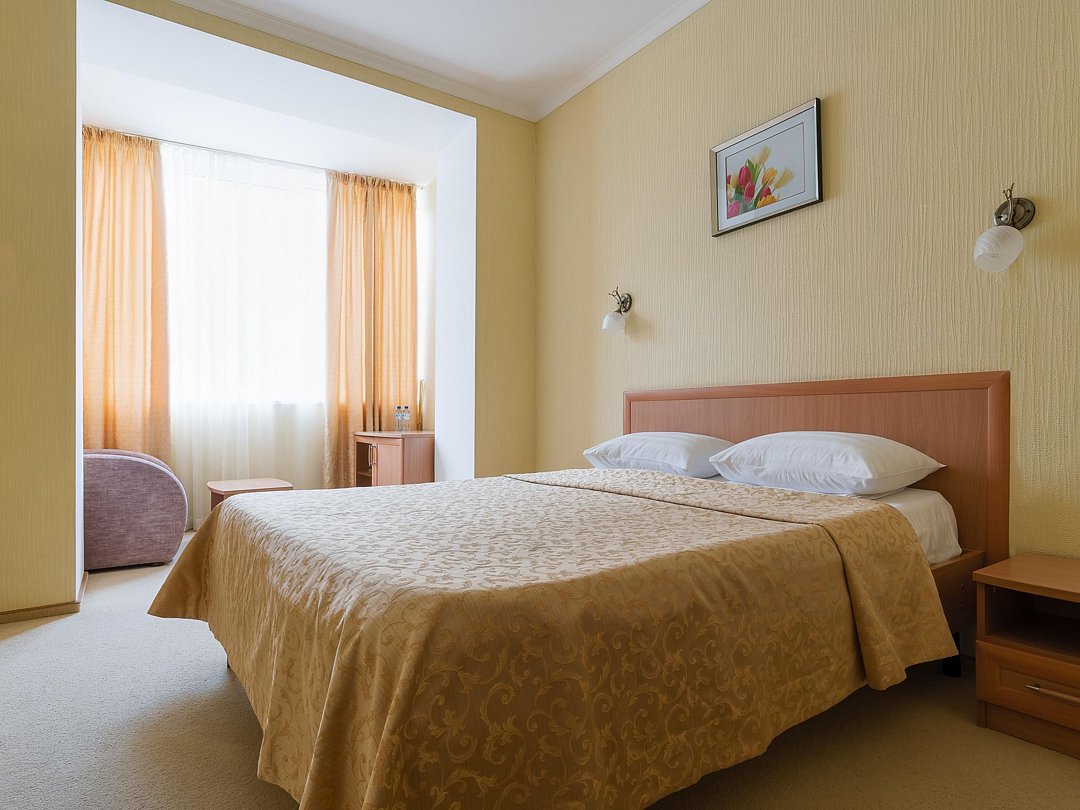 Уютный номер с двуспальной кроватью. В номере: кровать, прикроватные тумбы, раскладное кресло, мини-бар, холодильник, цифровое ТВ, рабочий стол, зеркало, телефон, подстановочный столик, шкаф-гардероб, багажница, посуда, плотные шторы для затемнения.