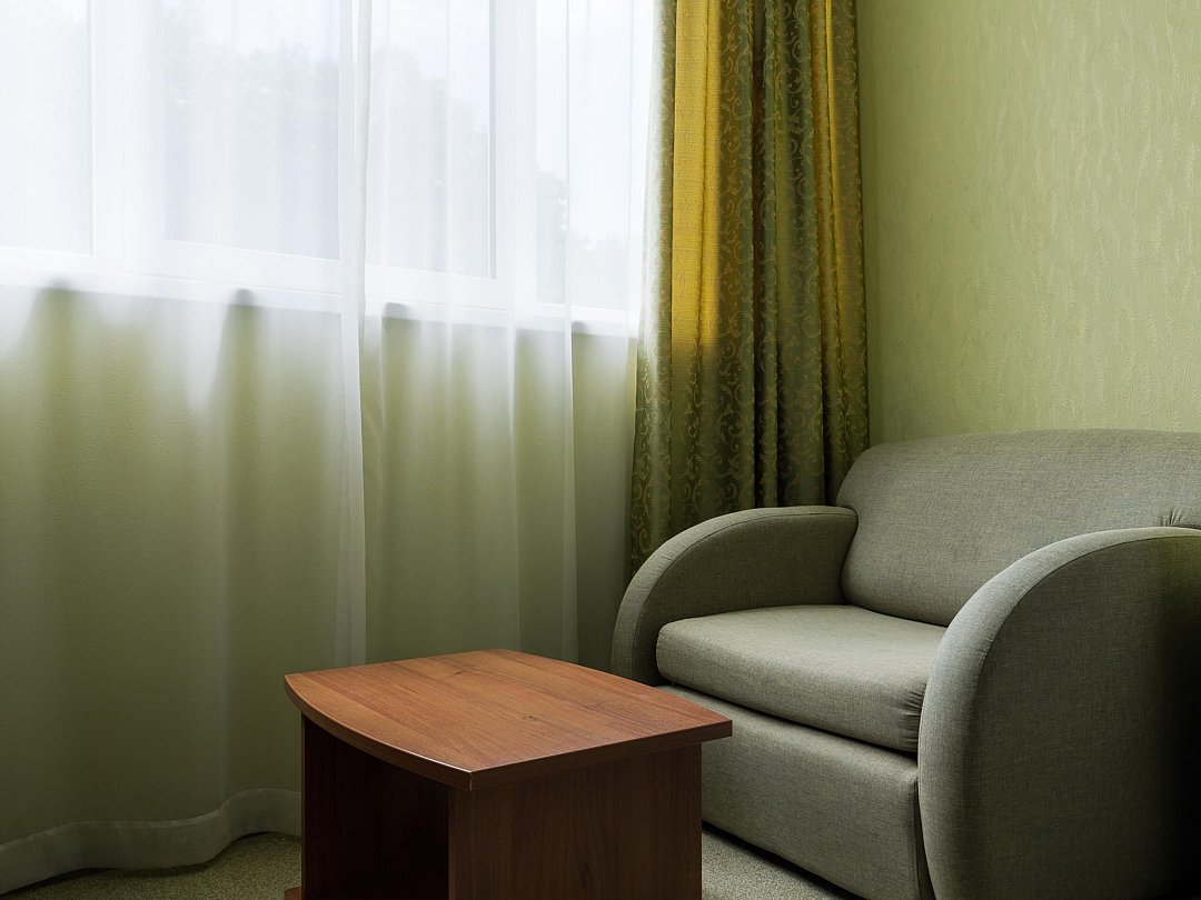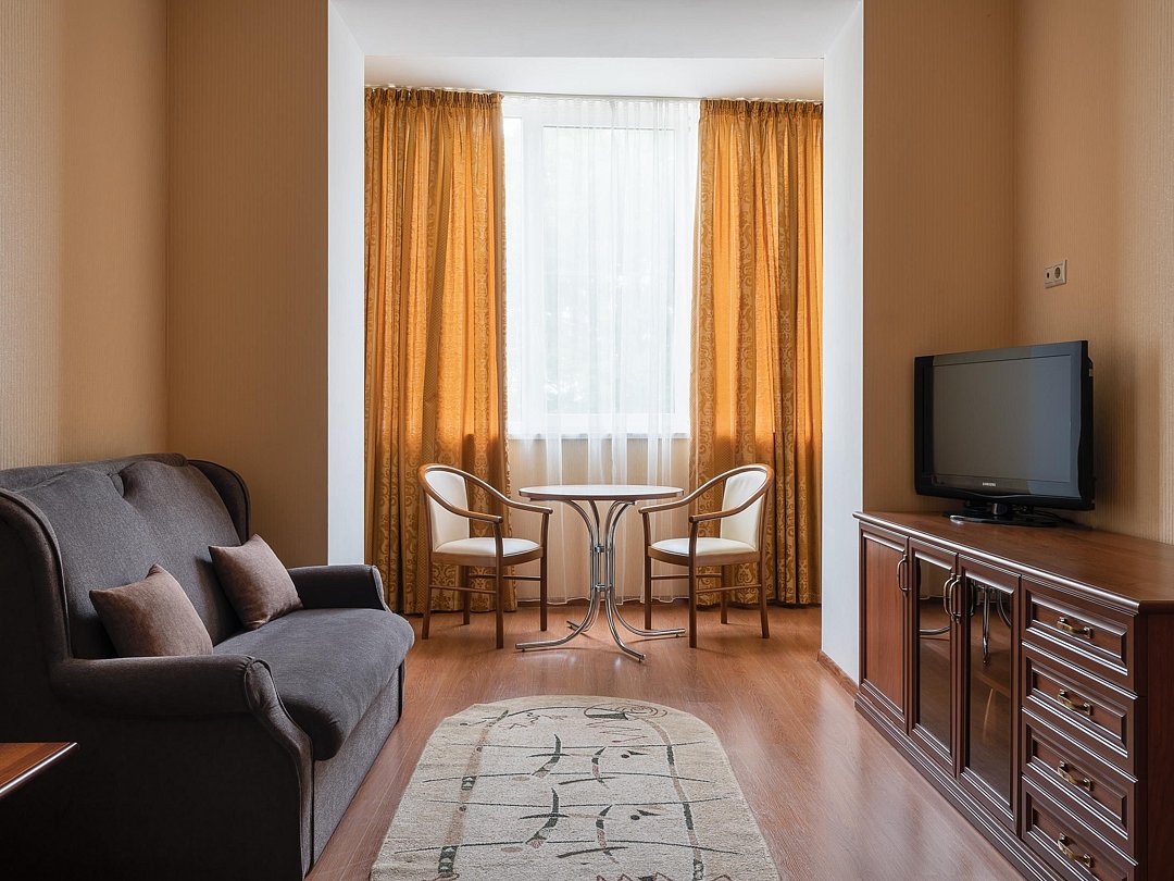 Просторный двухкомнатный номер. В номере: кровать, прикроватные тумбы, кресло, диван раскладной, мини-бар, холодильник, цифровое ТВ в обеих комнатах, рабочий стол, зеркало, телефон, подстановочный столик, шкаф-гардероб, багажница, набор посуды, плотные шторы для затемнения.