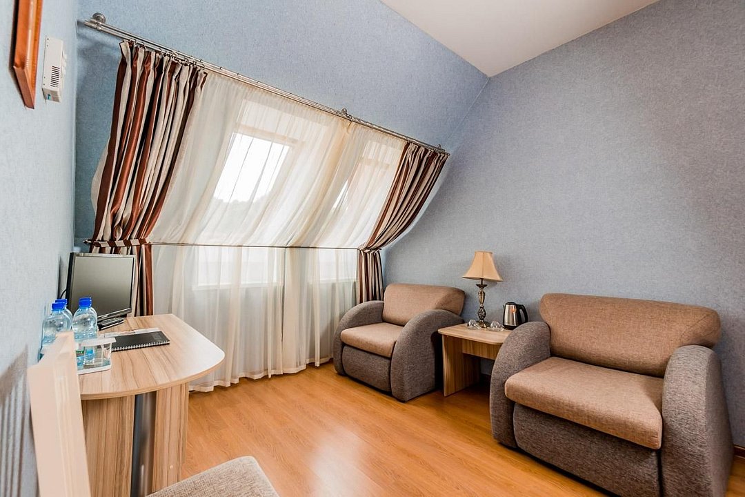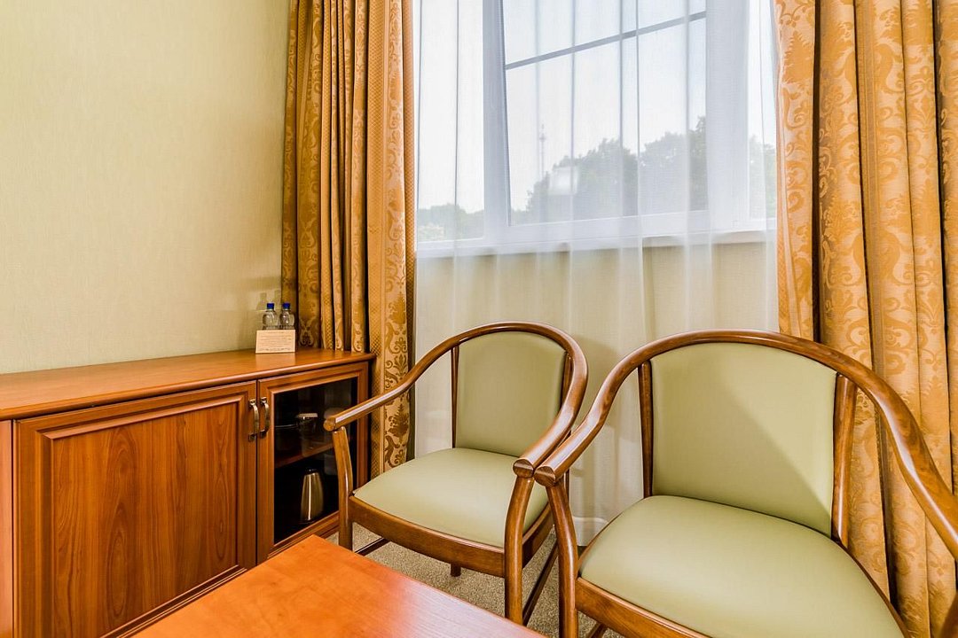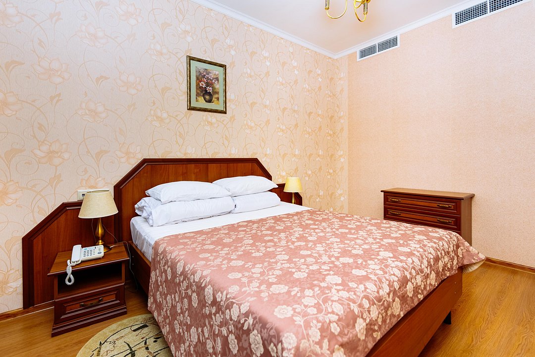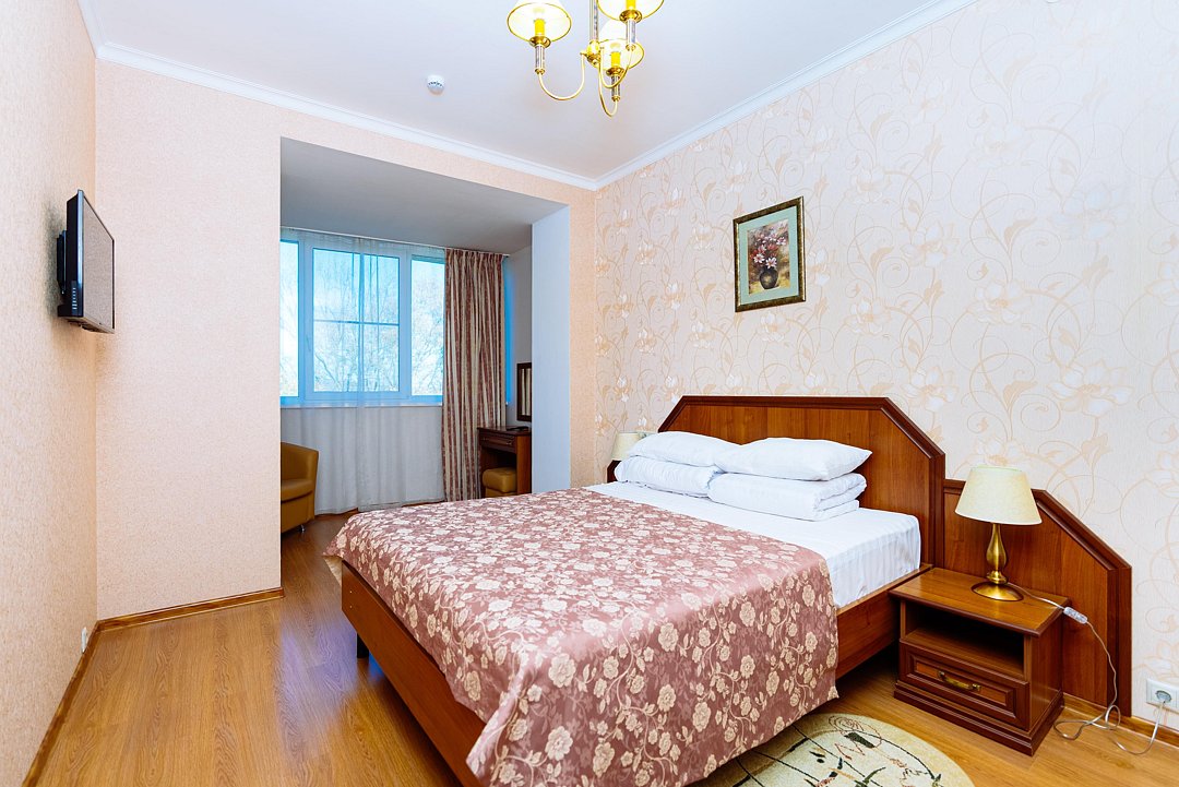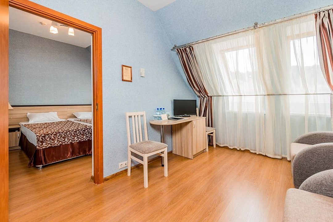 Удобный двухкомнатный номер. В номере: кровати, прикроватные тумбы, два кресла, мини-бар, холодильник, цифровое ТВ в каждой комнате, рабочий стол, зеркало, телефон, подстановочный столик, шкаф-гардероб, багажница, посуда, плотные шторы для затемнения.