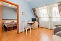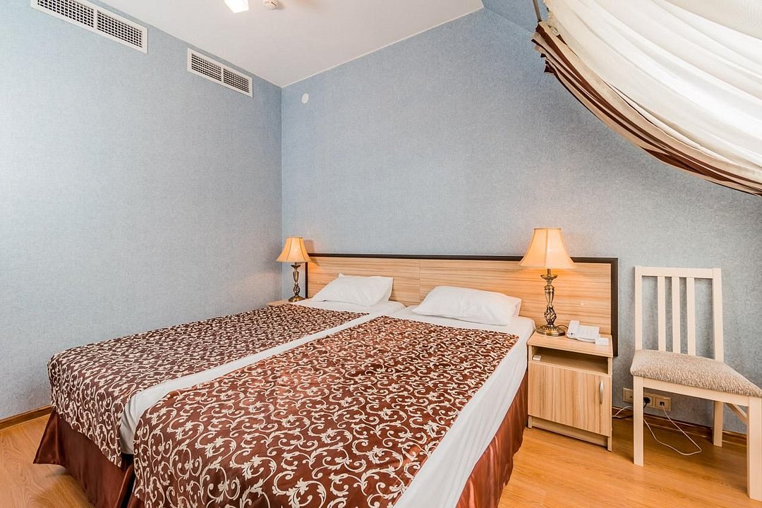 Аккуратный современный номер. В номере: кровати, прикроватные тумбы, раскладное кресло, мини-бар, холодильник, цифровое ТВ, рабочий стол, зеркало, телефон, подстановочный столик, шкаф-гардероб, багажница, посуда, плотные шторы для затемнения.