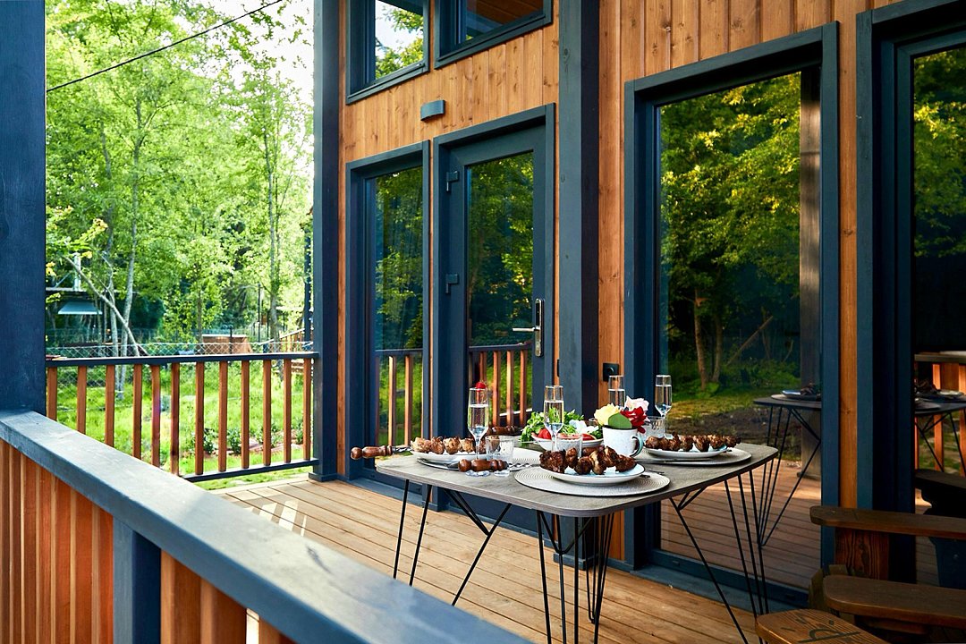 Уютные домики и искусно обустроенные зоны отдыха создают атмосферу домашнего уюта и уединения. Гости могут расслабиться у большого бассейна, разделенного на зоны для взрослых и детей, или погрузиться в размышления, сидя в одной из беседок, где воздух пропитан ароматами леса и свежей зелени.