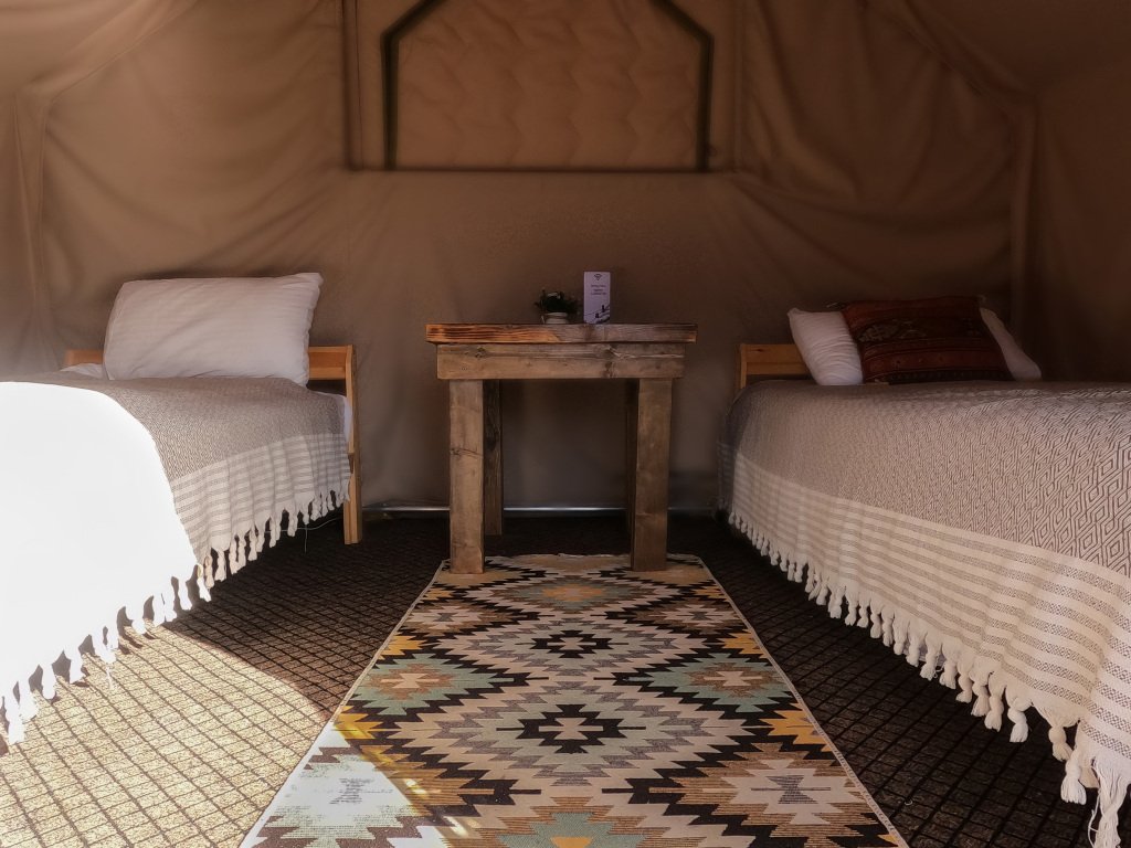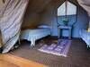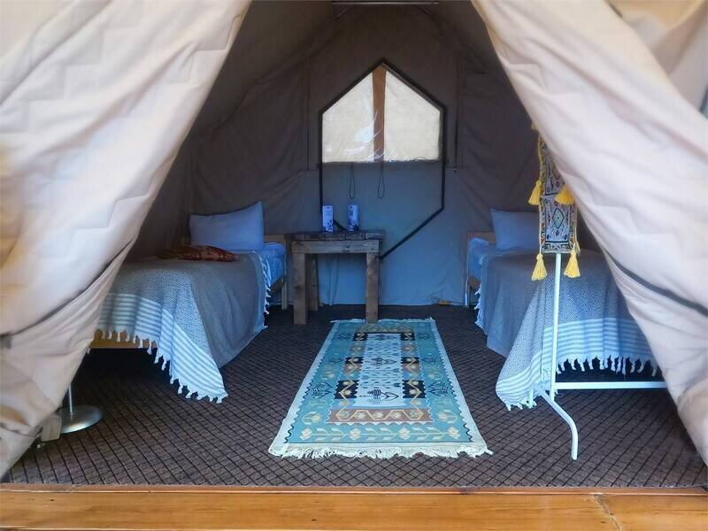 Двухкомнатный домик на 5 гостей, с добавлением допмест - 7 гостей. Первая комната: - мини-кухня с холодильником - душ и туалет в номере - кровать qwin size c выдвижной односпальной кроватью - окно от пола до потолка Коридор площадью Вторая комната: - две односпальные кровати - окно от пола до потолка Собственная терраса, мангал включен в стоимость Завтраки в верхнем глэмпинге (вверх 5-7 минут пешком). Важно! Благоустройство территории в процессе, нет дорожек. Поэтому размещение на данный момент - по тестовой стоимости.Шатёр 2 местный №4 стандарт (общая ванная комната)