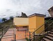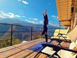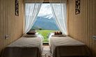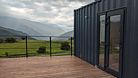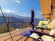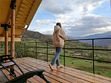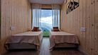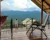 терраса, две односпальные кровати, стулья, журнальный столик, вид во двор, панорамные окна, вид на горы, частный двор, окна от пола до потолкаВ домике