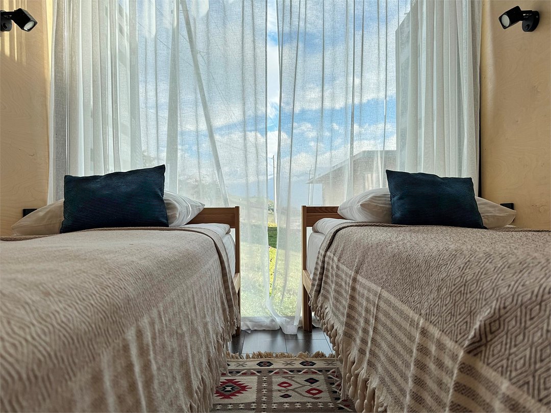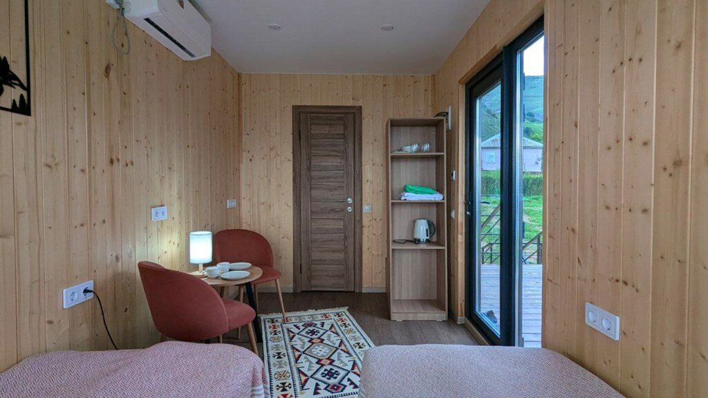 водонагреватель, банные полотенца, терраса, две односпальные кровати, стулья, чайник, унитаз, раковина, ковровое покрытие, отдельный вход в номер, душ, стол, туалетные средства, вид на горы, теплые полы, вешалки-плечики, индивидуальный санузел в отдельно стоящем здании, мылоВ номере