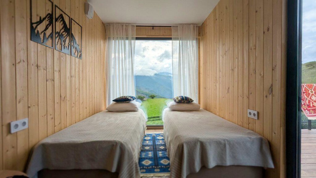 водонагреватель, банные полотенца, терраса, две односпальные кровати, стулья, чайник, унитаз, раковина, ковровое покрытие, отдельный вход в номер, душ, стол, туалетные средства, вид на горы, вешалки-плечики, индивидуальный санузел в отдельно стоящем здании, мылоВ номере