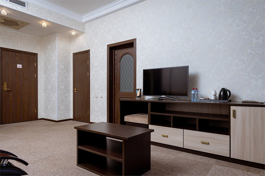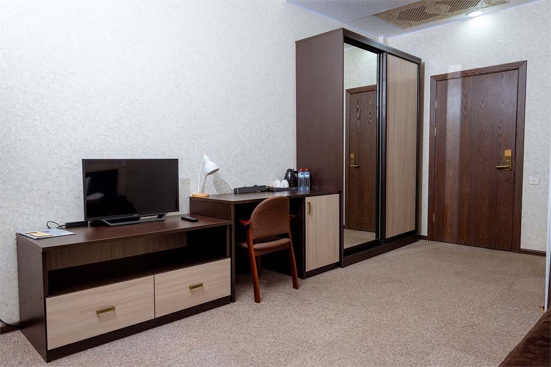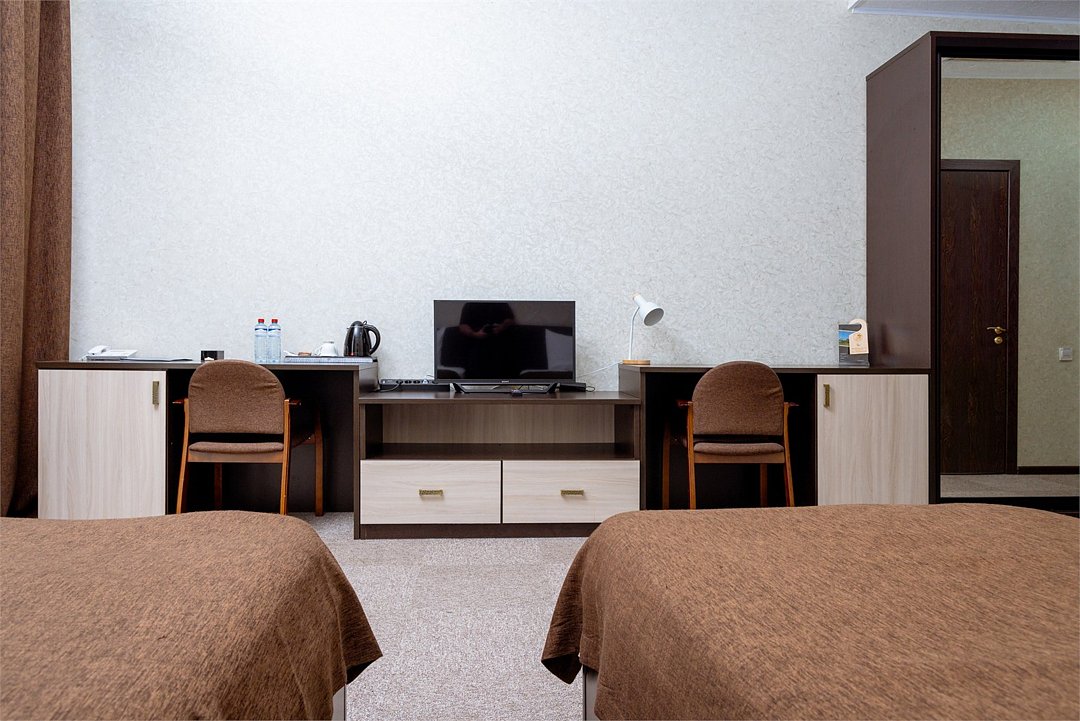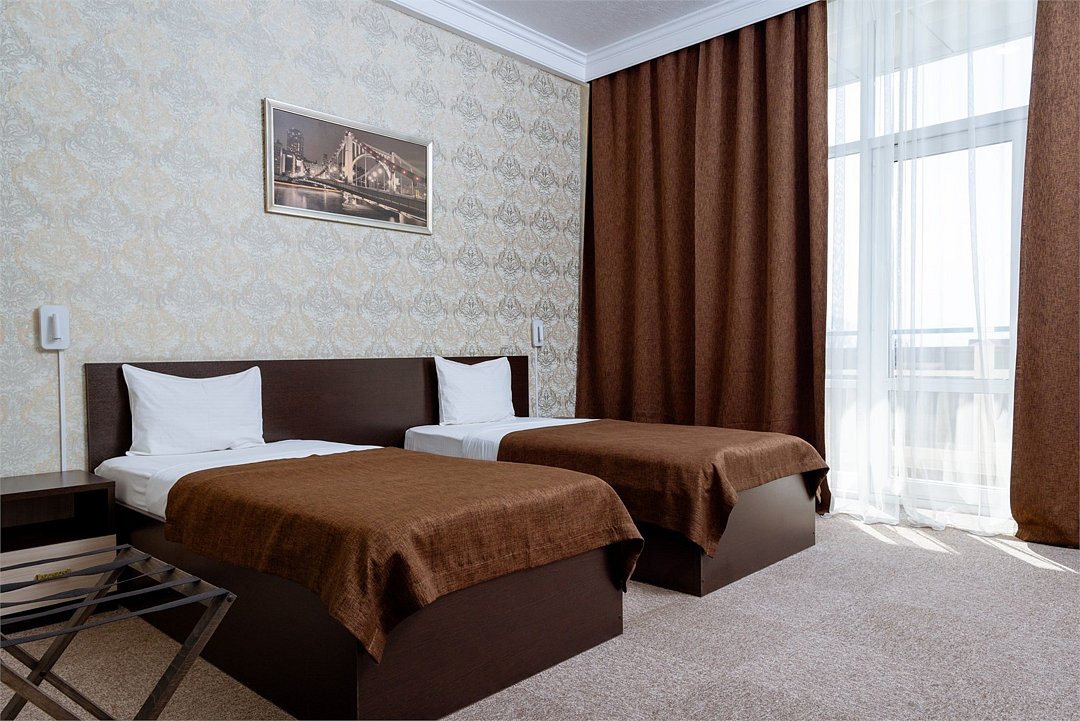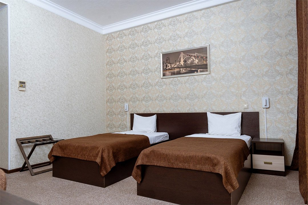 В номерах категории Делюкс с двумя раздельными кроватями возможно одноместное или двухместное размещение . Вы оцените высокие потолки, классический интерьер, все технологические удобства, которые должны быть в четырехзвёздочном отеле. Здесь вас ждёт комфортабельная обстановка, обеспечивающая полноценный отдых и возможность эффективной и плодотворной работы. Из окна открывается очень красивый вид на Грозненское море.Услуги и удобства