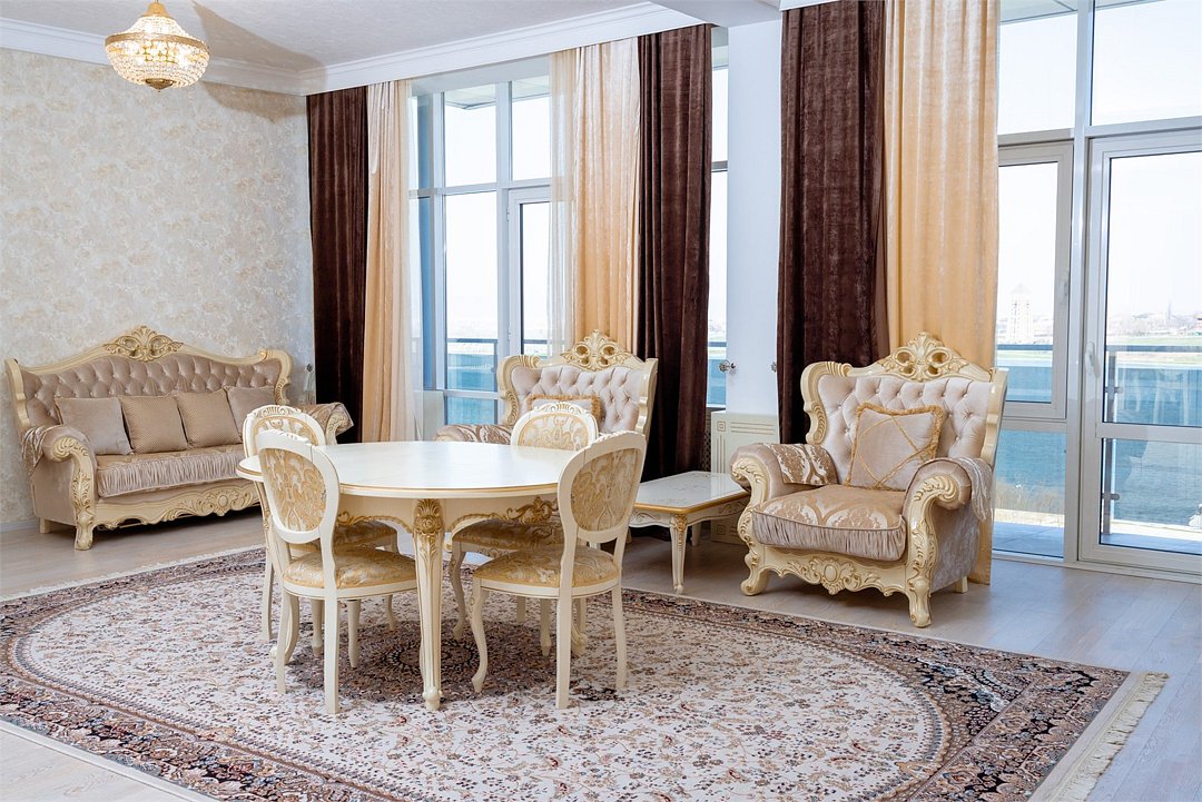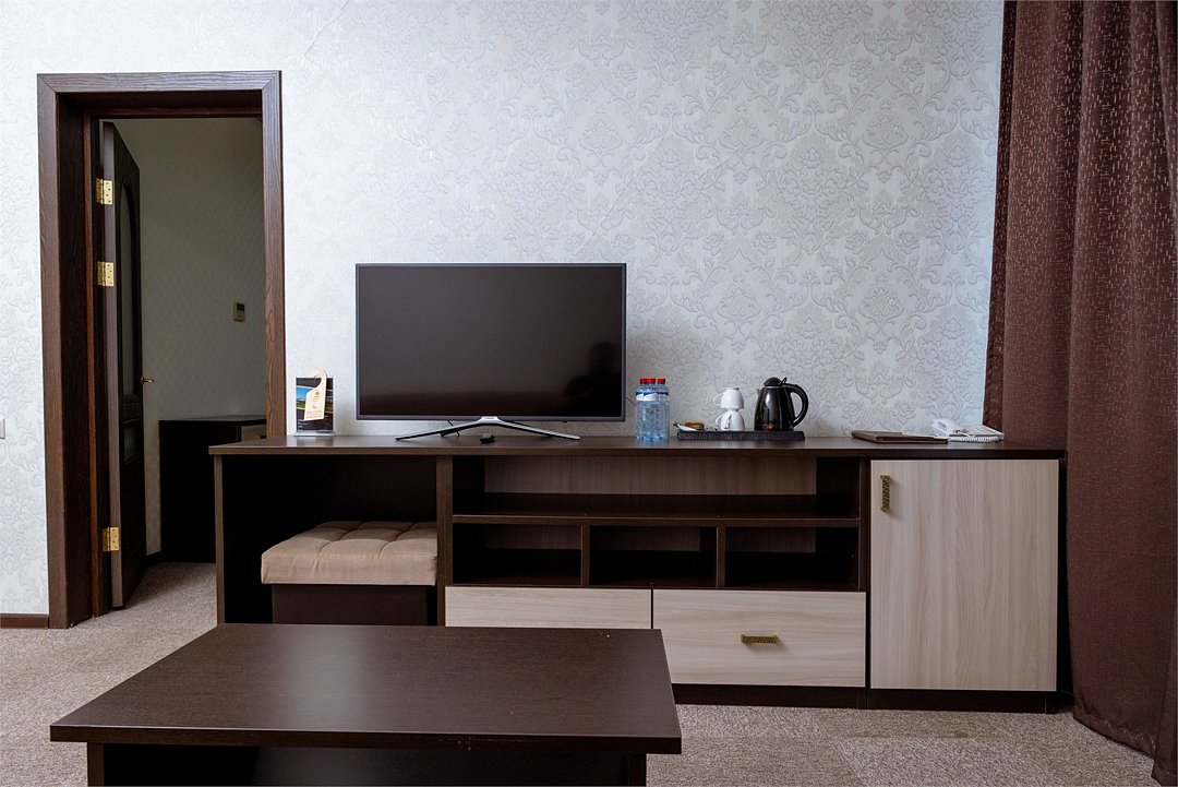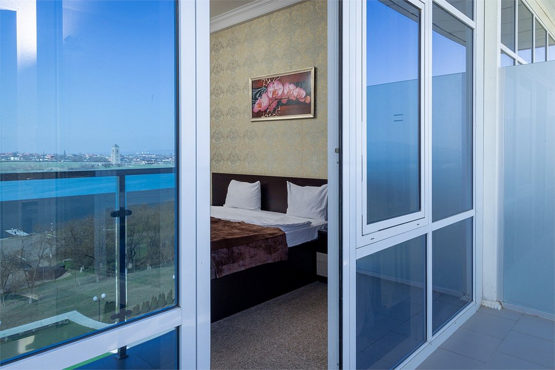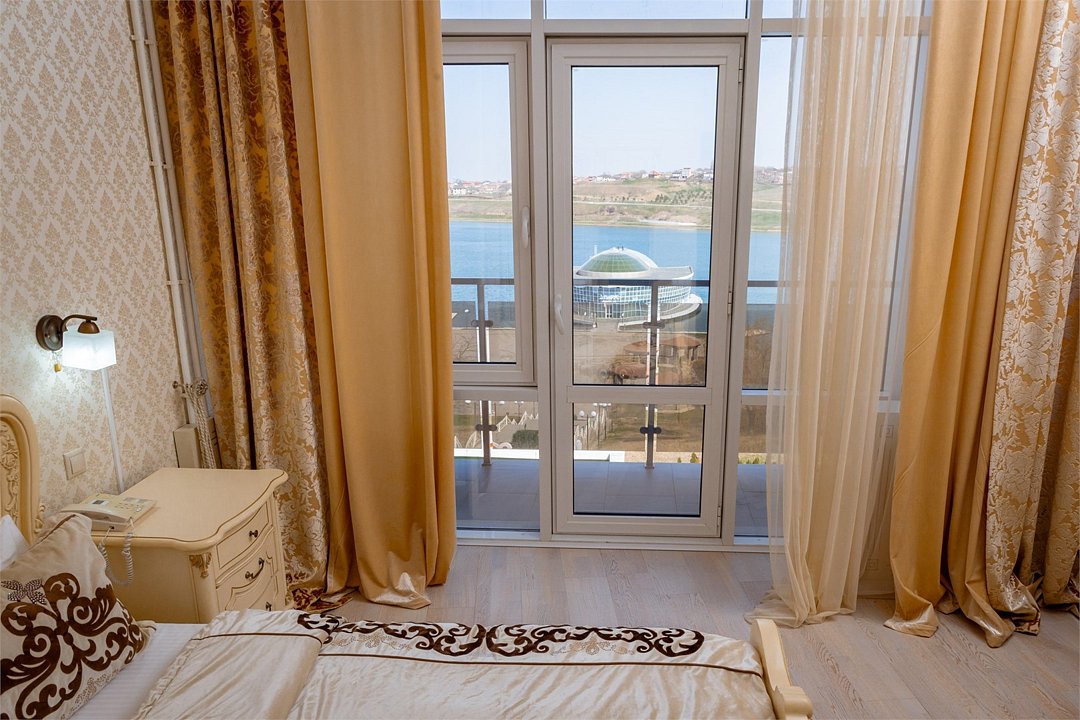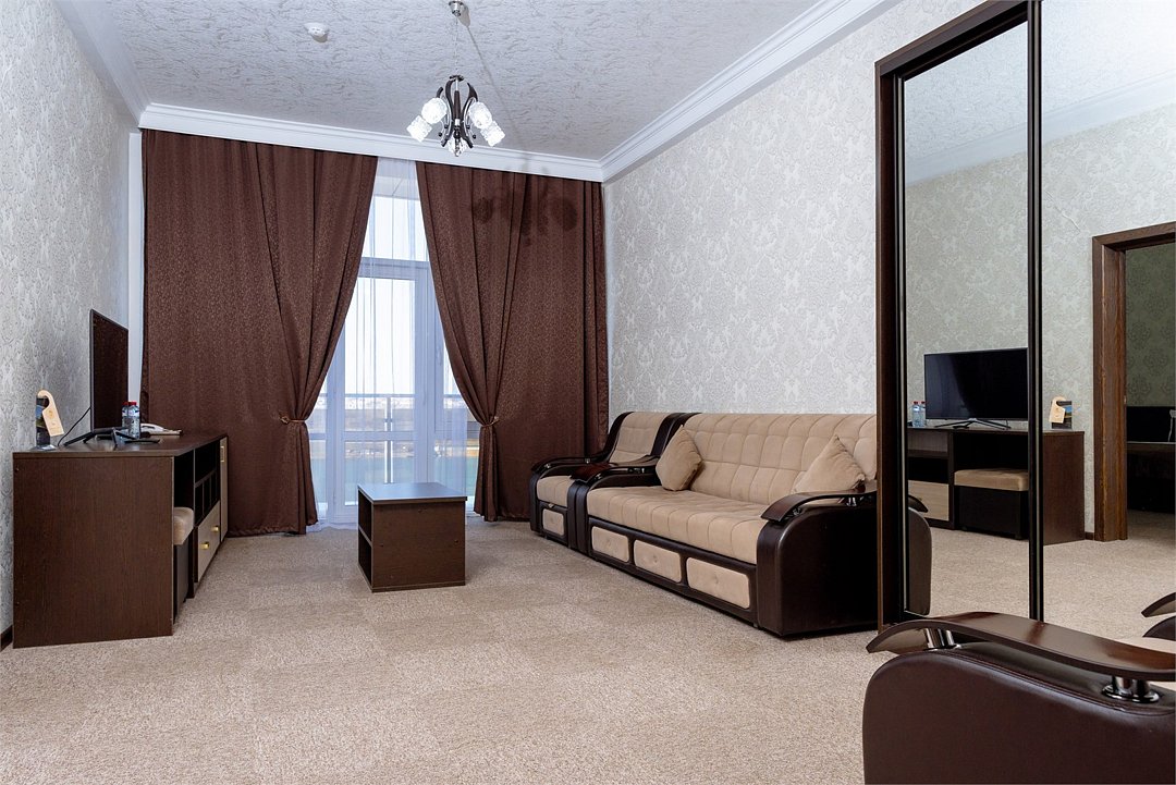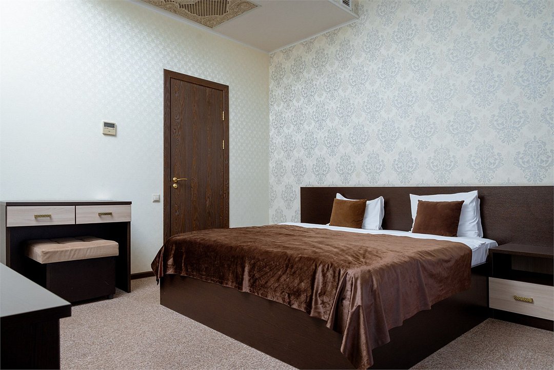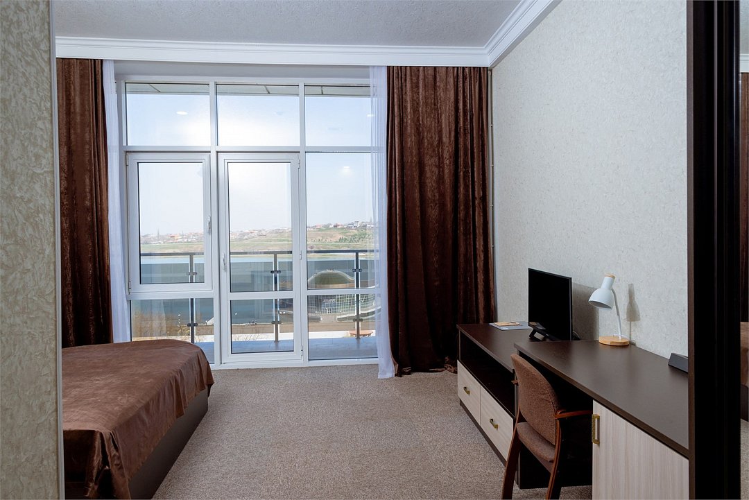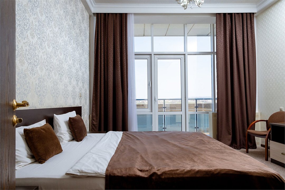 В номерах категории Делюкс с двуспальной кроватью возможно одноместное или двухместное размещение . Вы оцените высокие потолки, классический интерьер, все технологические удобства, которые должны быть в четырехзвёздочном отеле. Здесь вас ждёт комфортабельная обстановка, обеспечивающая полноценный отдых и возможность эффективной и плодотворной работы. Из окна открывается очень красивый вид на Грозненское море.Услуги и удобства