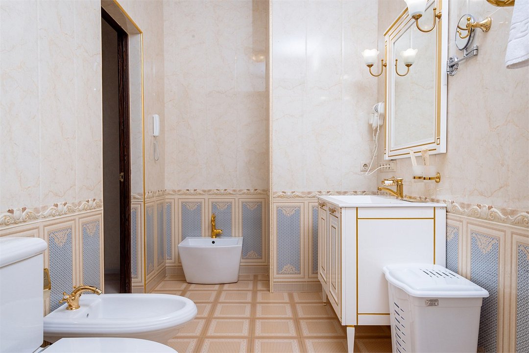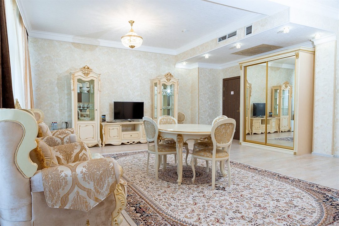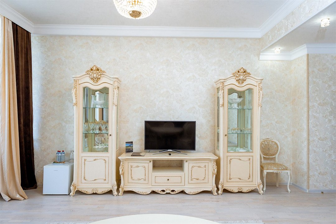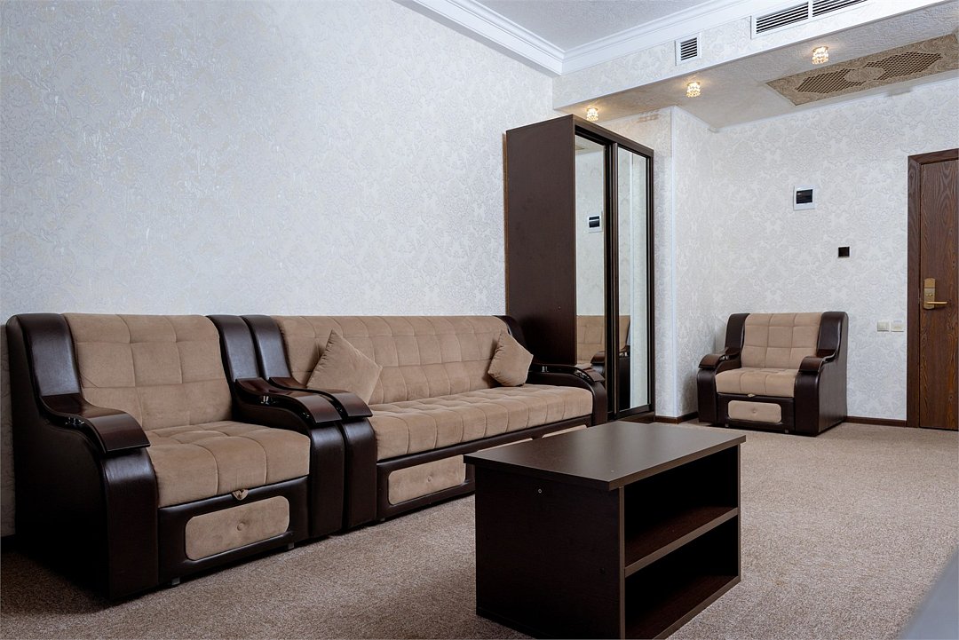 Номер категории Люкс состоит из двух комнат - спальная комната и гостиная , идеально подходящие для отдыха всей семьей или с друзьями. Также имеется 2 ванные комнаты, в одной из них находится душ, в другой глубокая ванна. Вы можете полностью расслабиться, приняв ванну с ароматной пеной.Услуги и удобства