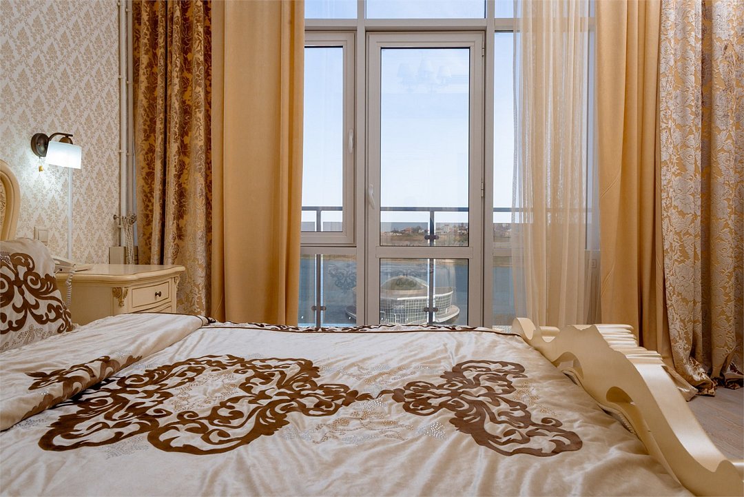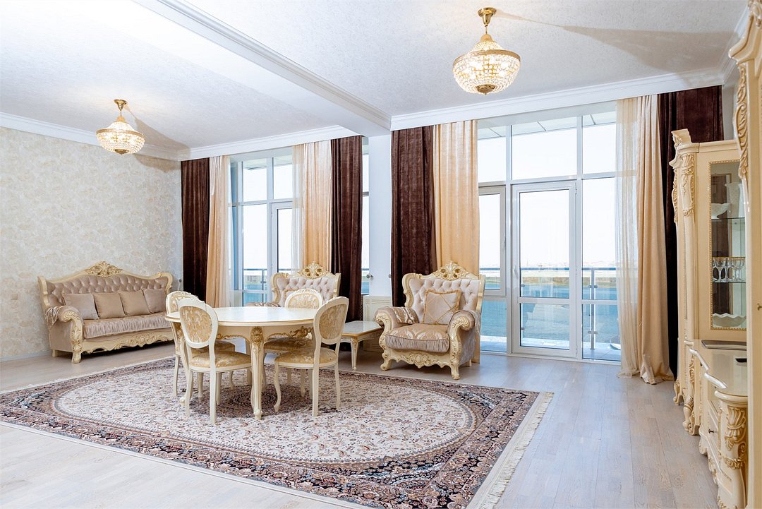 Wi-Fi, телефон, настольные лампы, фен, электронные замки, ванная комната, ванна или душевая кабина, халаты, банные полотенца, тапочки, балкон с красивым видом, двуспальная кровать, диван, стулья, зеркало, две комнаты, сейф, чайник, унитаз, питьевая вода, гостиная зона, вид на море, высокие потолки, стол, мини-холодильник, шкаф-купе, телевизор со Smart TV, фитнес-зона, без питомцевВ номере