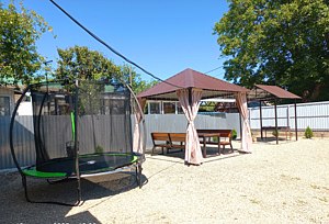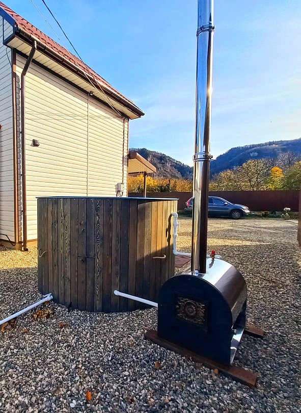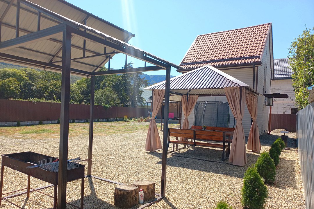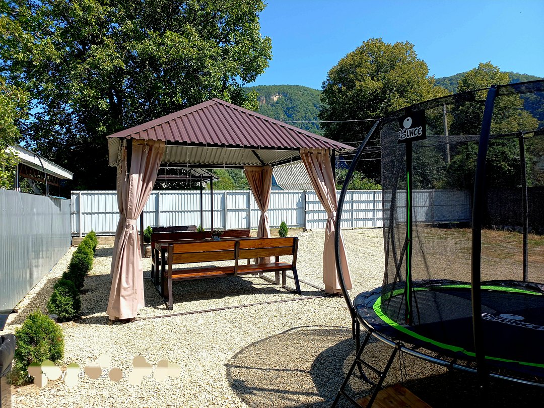 На придомовой территории в распоряжении отдыхающих мангальная зона для приготовления блюд на свежем воздухе, уютная беседка с видом на горы, батут, купель Фурако под открытым небом и парковочное место для автомобиля.