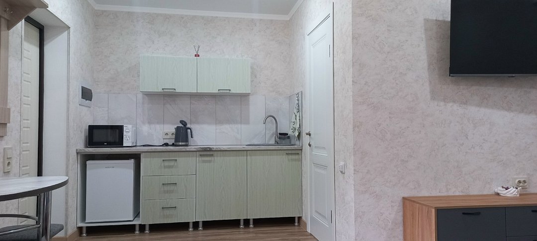 - кухонная зона: электрический чайник, микроволновая печь, плита индукционная, холодильник, посуда;