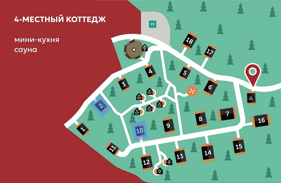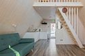 Дом с удобствами рассчитан на четыре человека. На первом уровне дома расположена гостиная, кухонная зона. В гостиной - раскладной диван для отдыха, который используется как спальное место (2 персоны). На втором уровне размещена спальная зона с двуспальным матрасом.Услуги и удобства