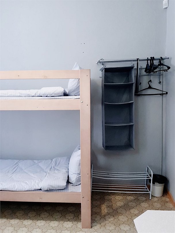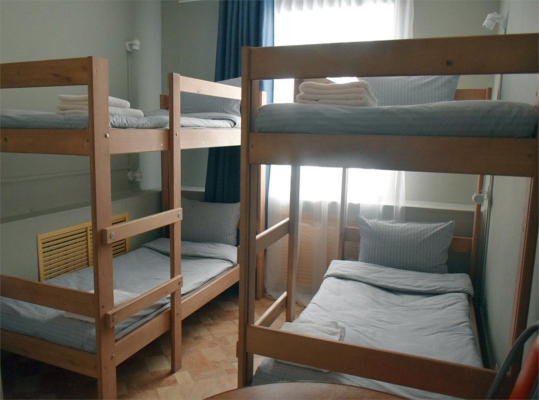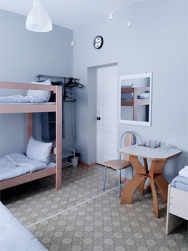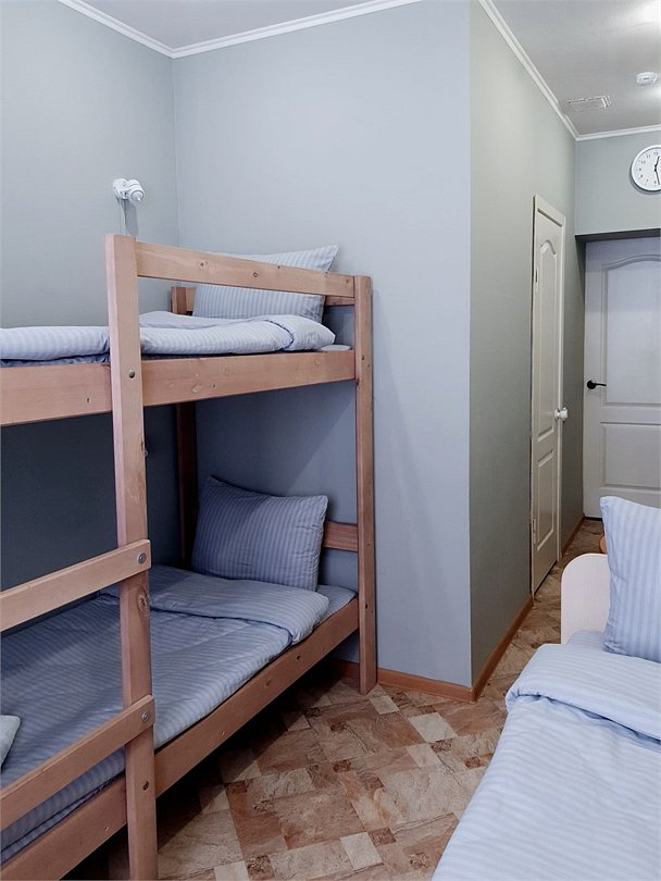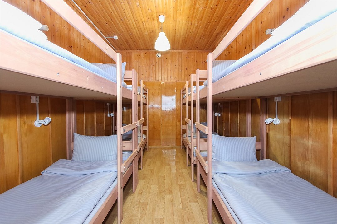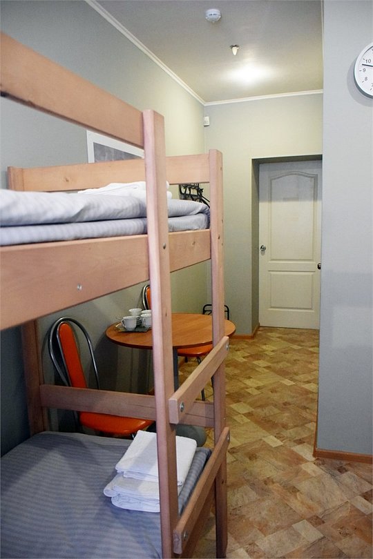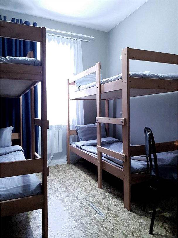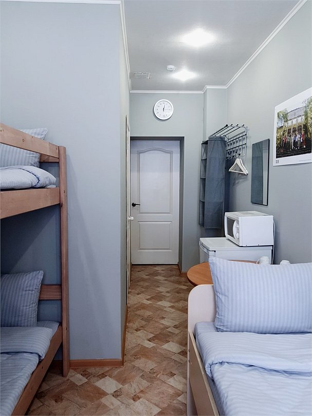 Общий шестиместный номер с тремя двухъярусными кроватями для мужчин и женщин. Также возможен вариант размещения в общем шестиместном номере с двумя односпальными кроватями и двумя двухъярусными кроватями для мужчин и женщин. Общий душ и санузел расположены на этаже.Услуги и удобства