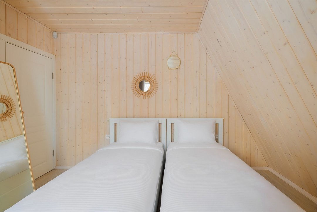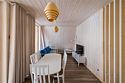 Дом с удобствами рассчитан на четыре человека. Сауна, электрический камин, цифровое телевидение к вашим услугам. На первом уровне дома расположена гостиная. В гостиной - раскладной диван для отдыха, который используется как спальное место (2 персоны). На втором уровне размещена спальная зона с двуспальным матрасом.Услуги и удобства