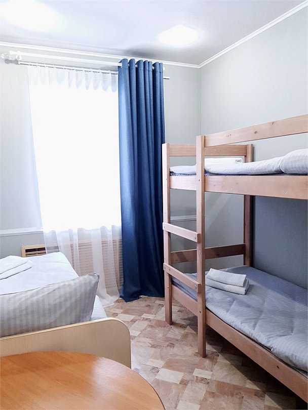 Номер с двумя односпальными и одной двухъярусной кроватью, а также возможен вариант размещения в номере с двумя двухъярусными кроватями. Душ, санузел на этаже.Услуги и удобства