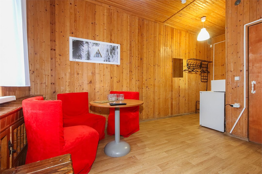 Дом с удобствами рассчитан на шесть человек. На первом уровне дома расположена гостиная, кухонная зона. В гостиной - раскладной диван для отдыха, который используется как спальное место (2 персоны). На втором уровне размещена спальная зона, в которой расположены двуспальный матрас и два односпальных матраса.Услуги и удобства
