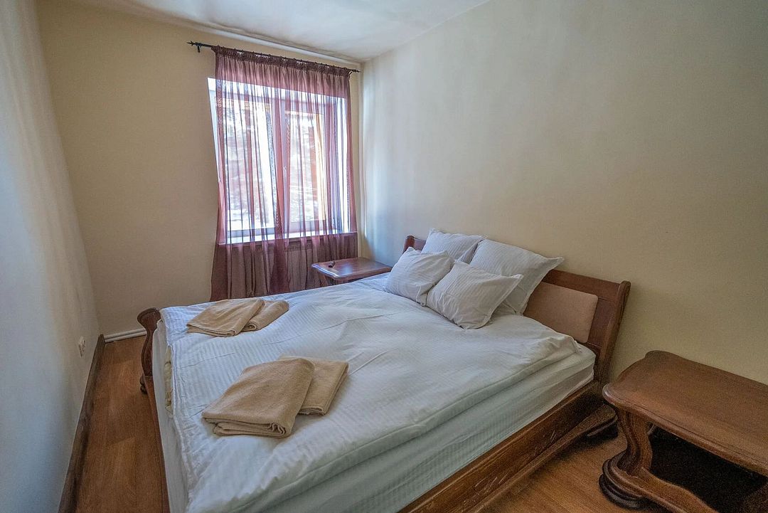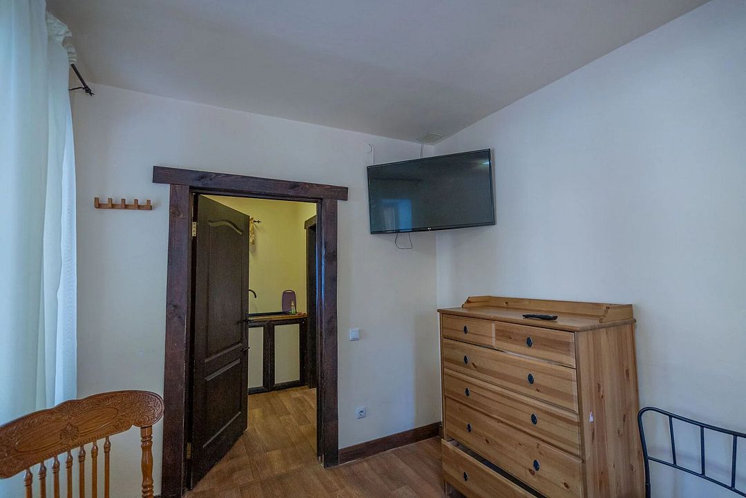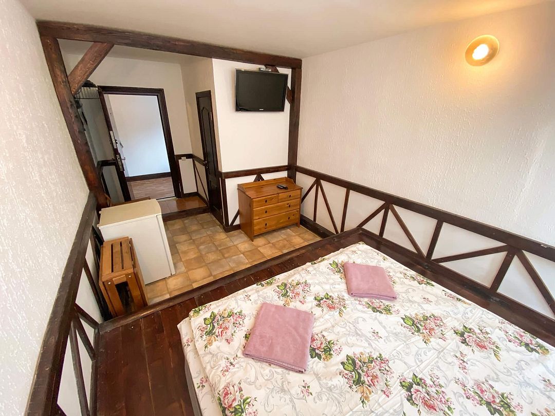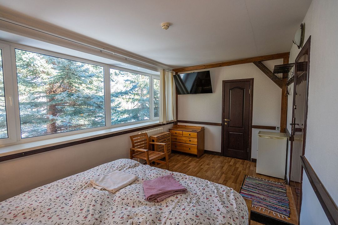 Уютные номера в главном здании гостиничного комплекса: двуспальная кровать 180 х 200 см, комплект постельного белья, полотенца, цифровое ТВ, мини-холодильник, санузел, душ на этаже, комод.