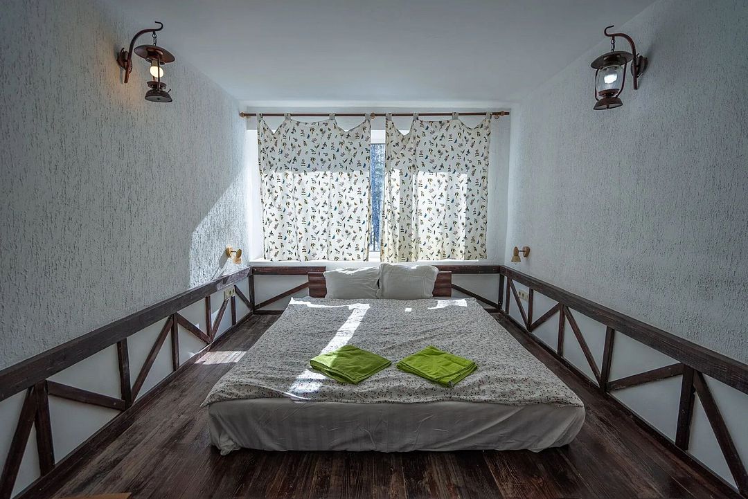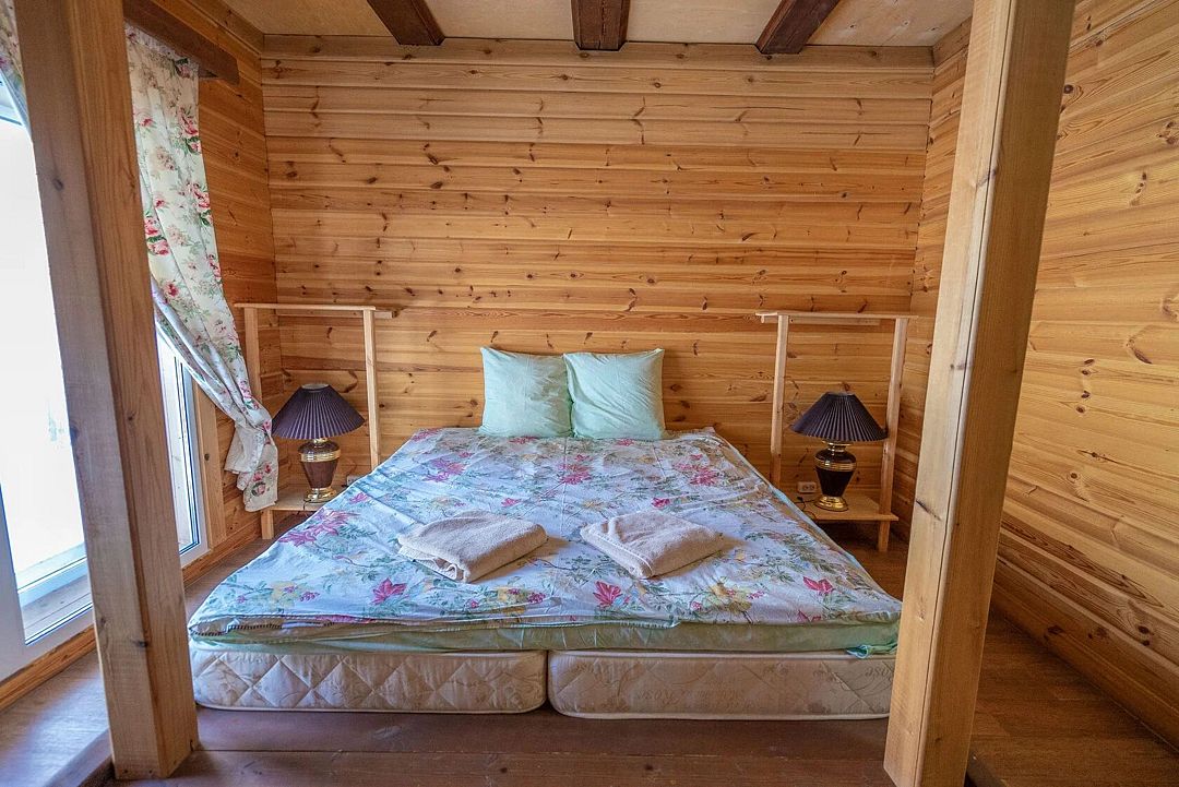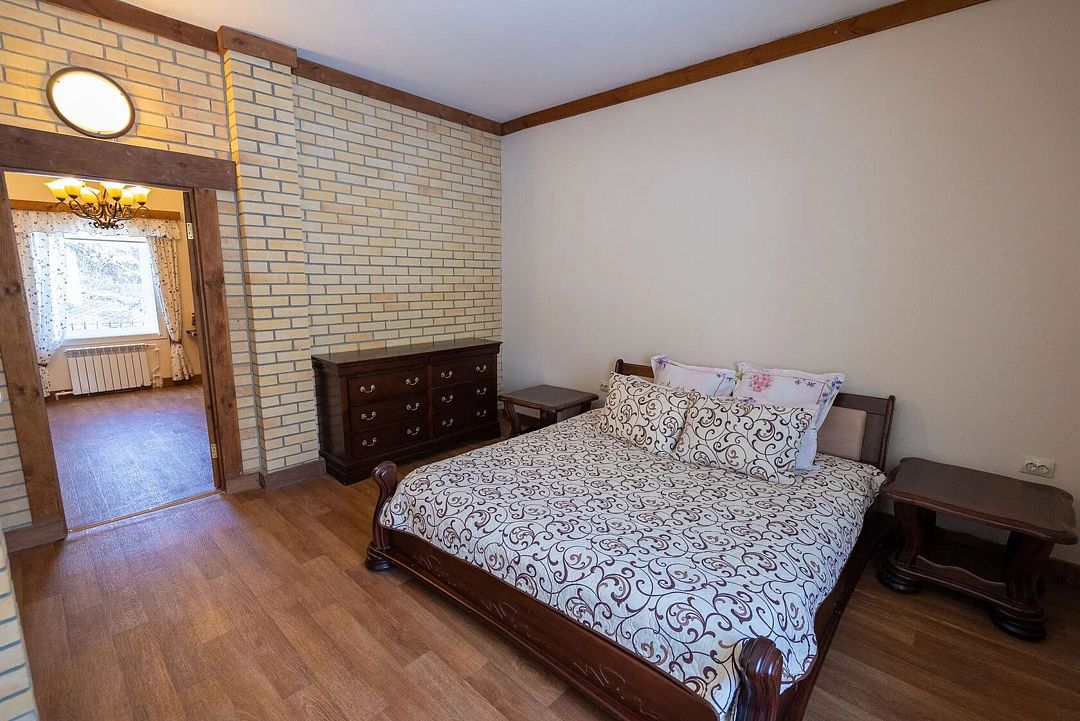 Двухэтажный дом на 12 человек со всеми удобствами. Первый этаж: 2 комнаты с двуспальной кроватью 180 х 200 см, 2 прикроватных столика с ночными лампами, комодом, косметическим столиком, стулом и санузлом (унитаз, умывальник, душ), комплект постельного белья с полотенцами.