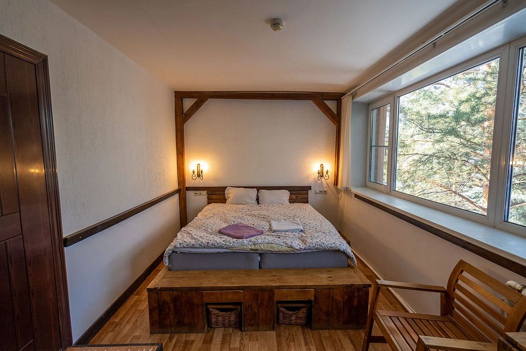 Уютные номера в главном здании гостиничного комплекса: двуспальная кровать 180 х 200 см, комплект постельного белья, полотенца, цифровое ТВ, мини-холодильник, санузел, умывальник, душ, комод.