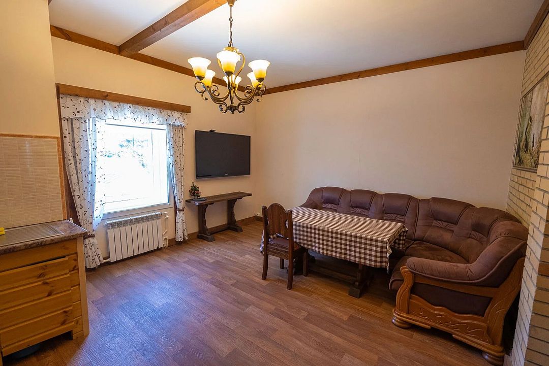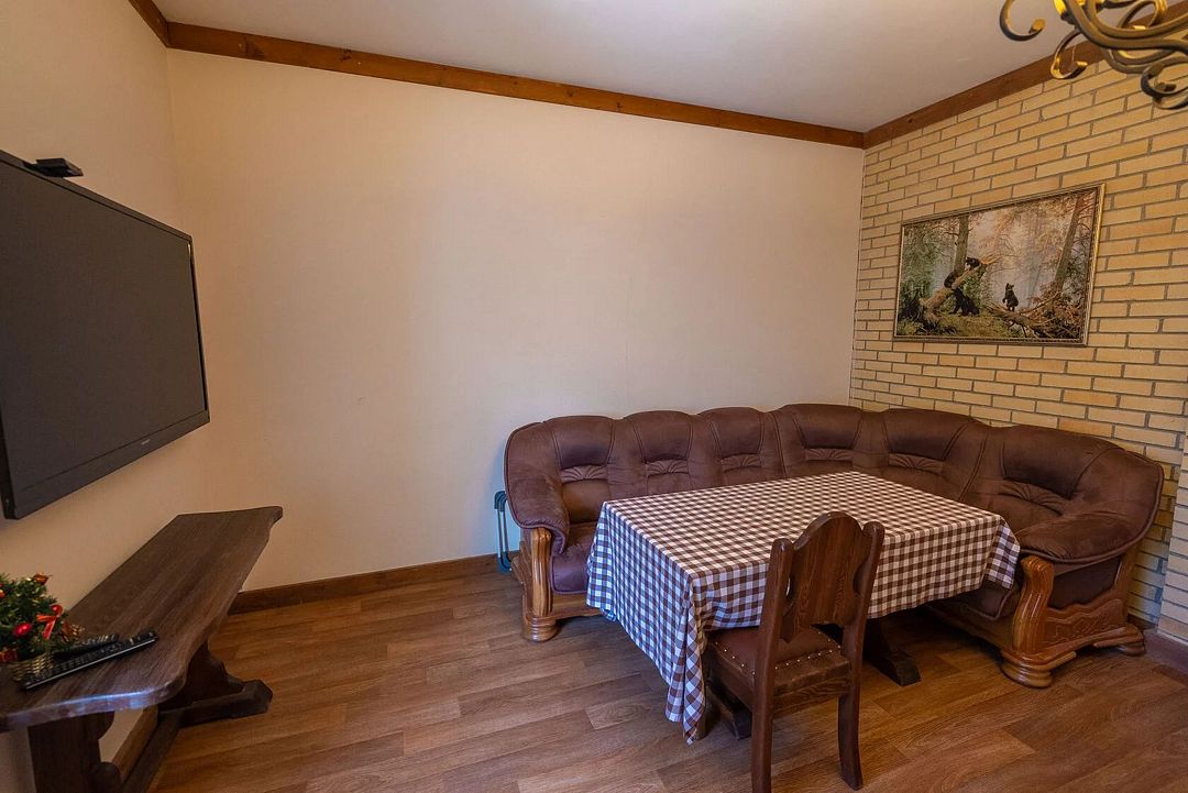 Апартаменты в трехэтажном доме на 6 номеров. Первая комната: кухонная зона (холодильник, четырехкомфорочная плита, набор кухонной и столовой посуды), обеденная зона с диваном, стульями и столом, цифровое ТВ.