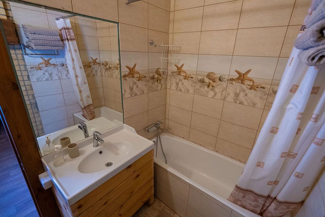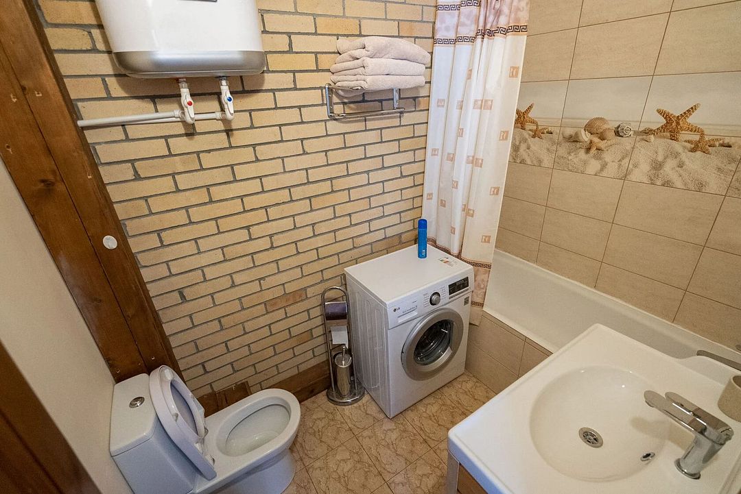 Вторая комната: двухспальная кровать 180 х 200 см, прикроватные столики с ночными лампами, детская кровать 160 х 80 см, комод, комплект постельного белья с полотенцами. Санузел: унитаз, рукомойник, ванна. Двухкомфорочная электрическая плита.
