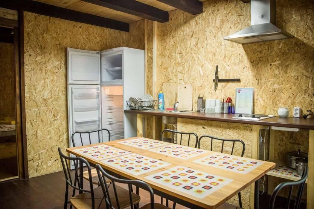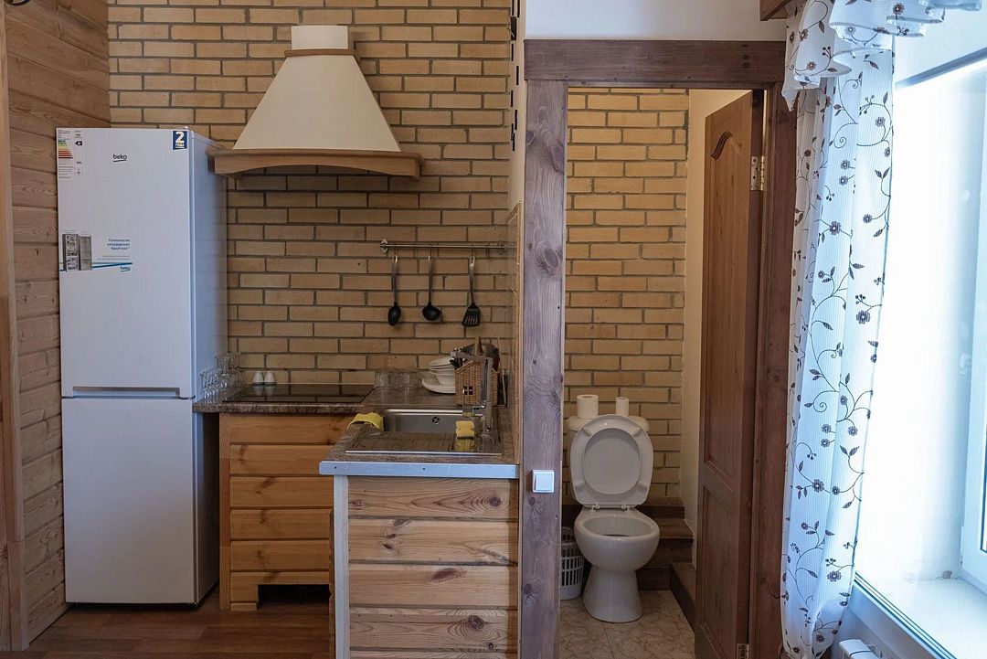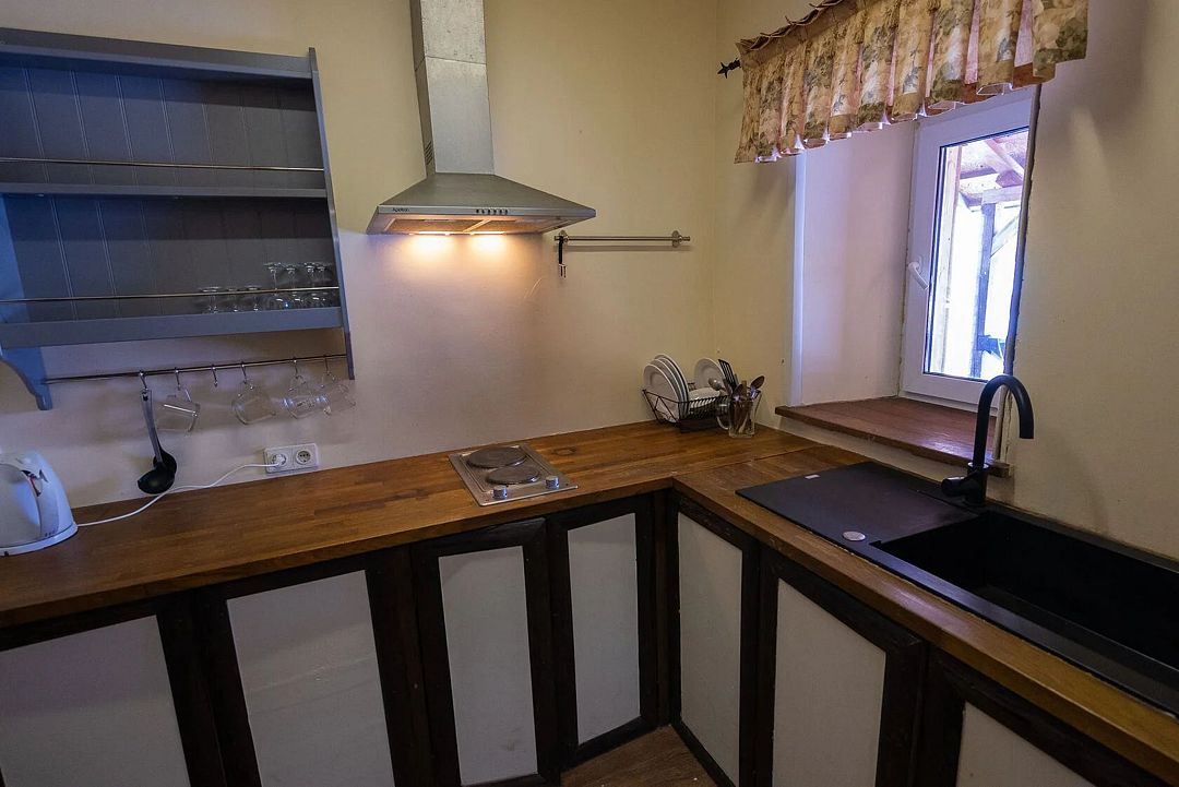 - общая гостинная с кухонной зоной (холодильник, двухкомфорочная плита, набор кухонной и столовой посуды)
