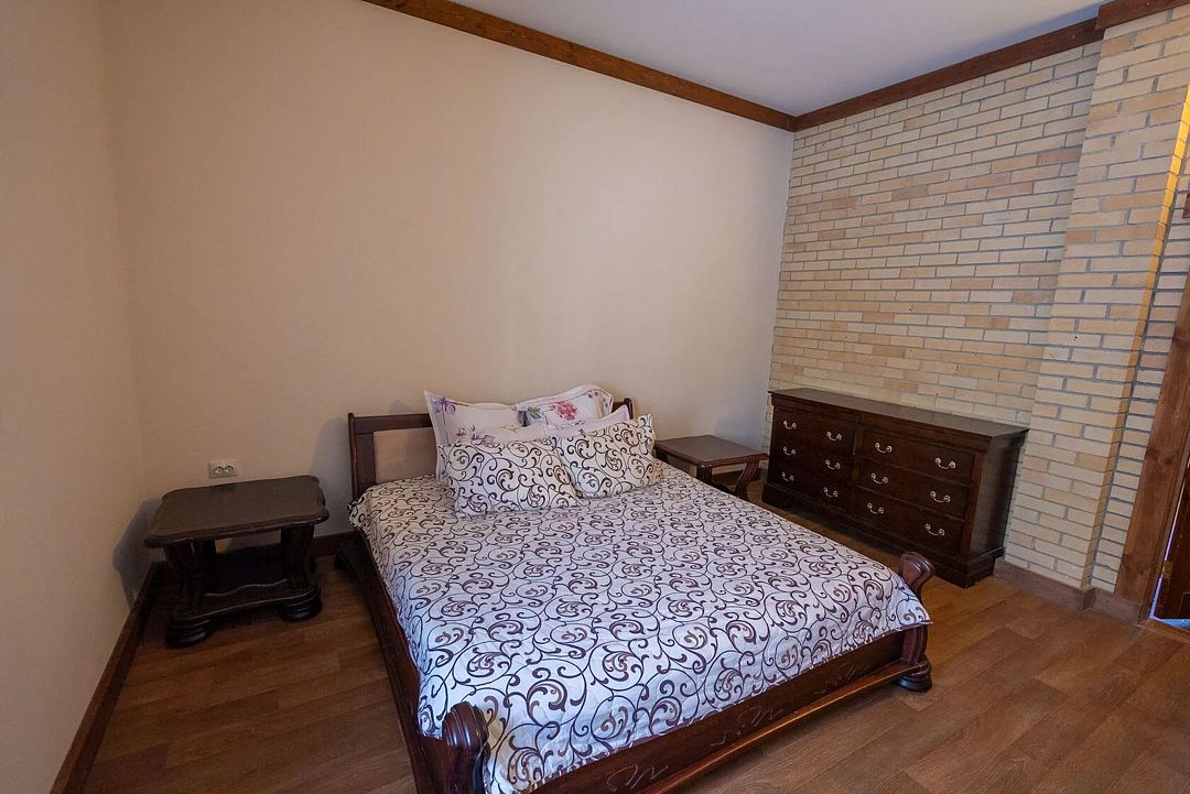 Второй этаж: 3 комнаты с двуспальной кроватью 180 х 200 см и комодом, комплект постельного белья с полотенцами, санузел (унитаз, умывальник), балкон, цифровое ТВ; мангальная зона с беседкой.