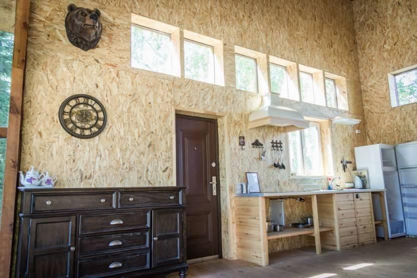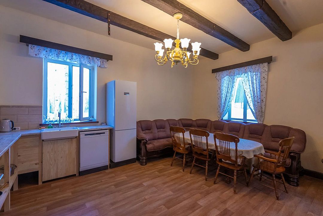 Двухэтажный дом на 3 пары с детьми. Первый этаж: 1 комната с двуспальной кроватью 180 х 200 см и комодом, комплект постельного белья с полотенцами, общая гостиная с кухонной зоной (холодильник, четырехкомфорочная плита, наборы кухонной и столовой посуды), обеденный стол и 4 стула, санузел (унитаз, умывальник, душевая кабина), цифровое ТВ.