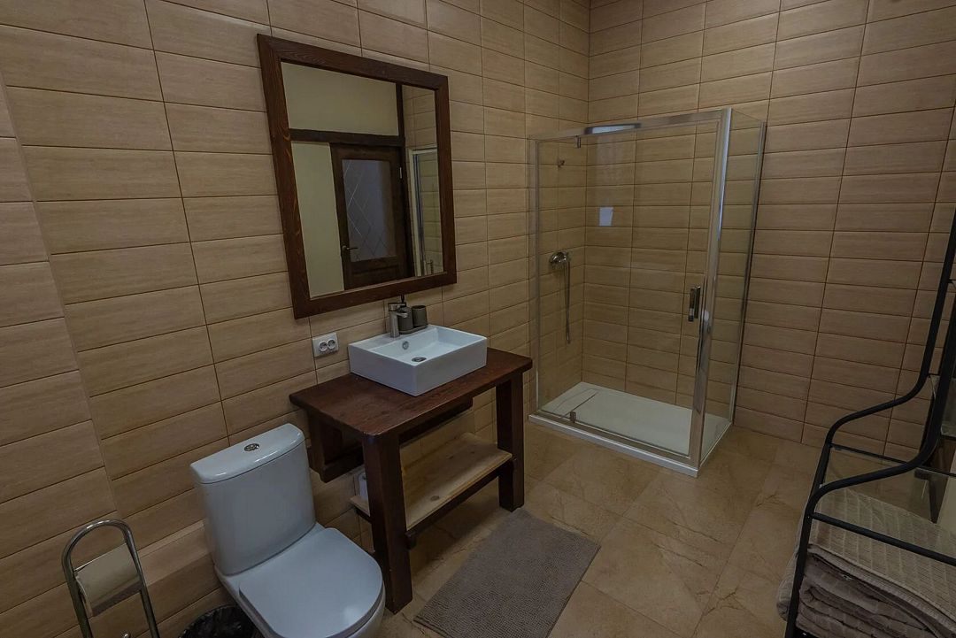 Второй этаж: 2 комнаты с двуспальной кроватью 180 х 200 см и комодом, комплект постельного белья с полотенцами, санузел в каждой комнате (унитаз, умывальник, душевая кабина), в каждой жилой комнате есть диван; мангальная зона с беседкой.