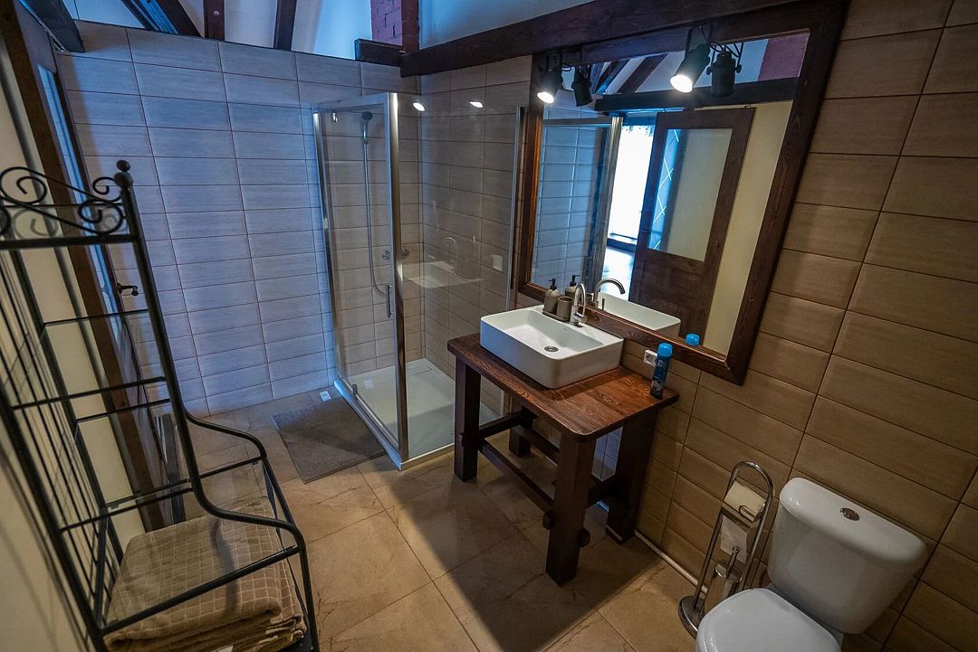 - 2 комнаты с двуспальной кроватью 180 х 200 см., 2 прикроватными лампами, комодом и санузлом (унитаз, умывальник, душ)