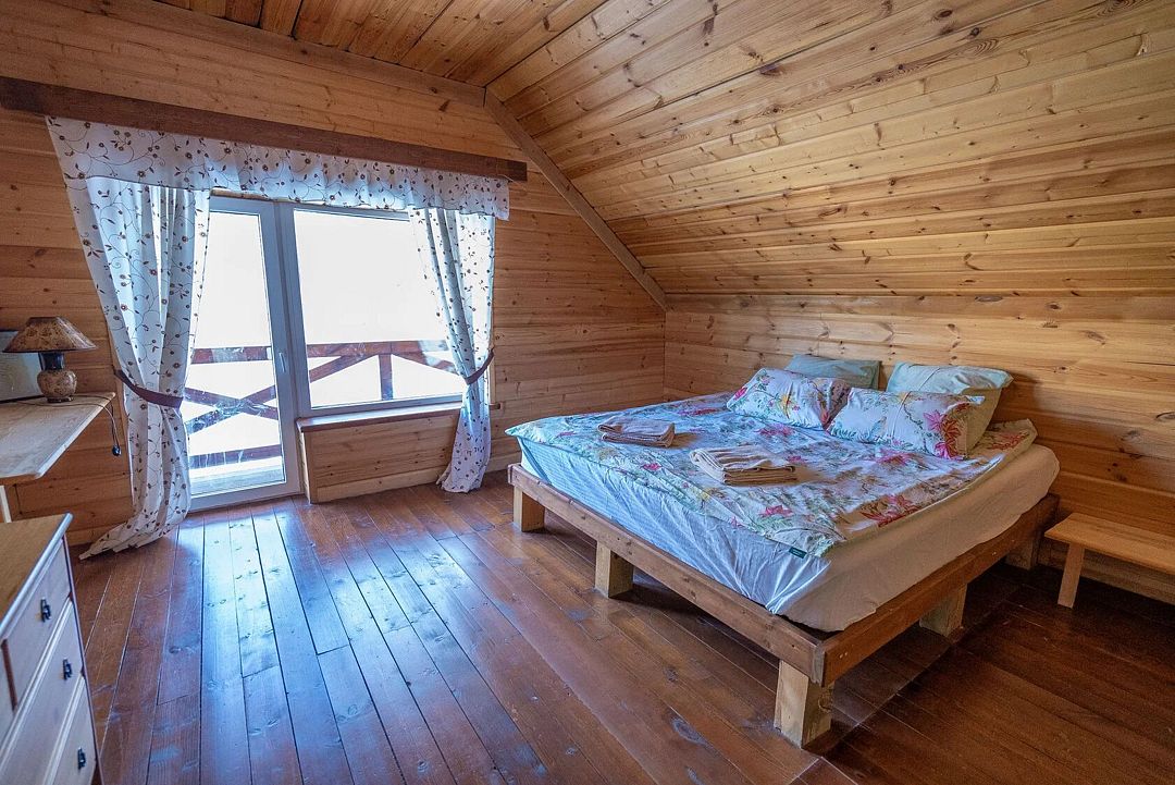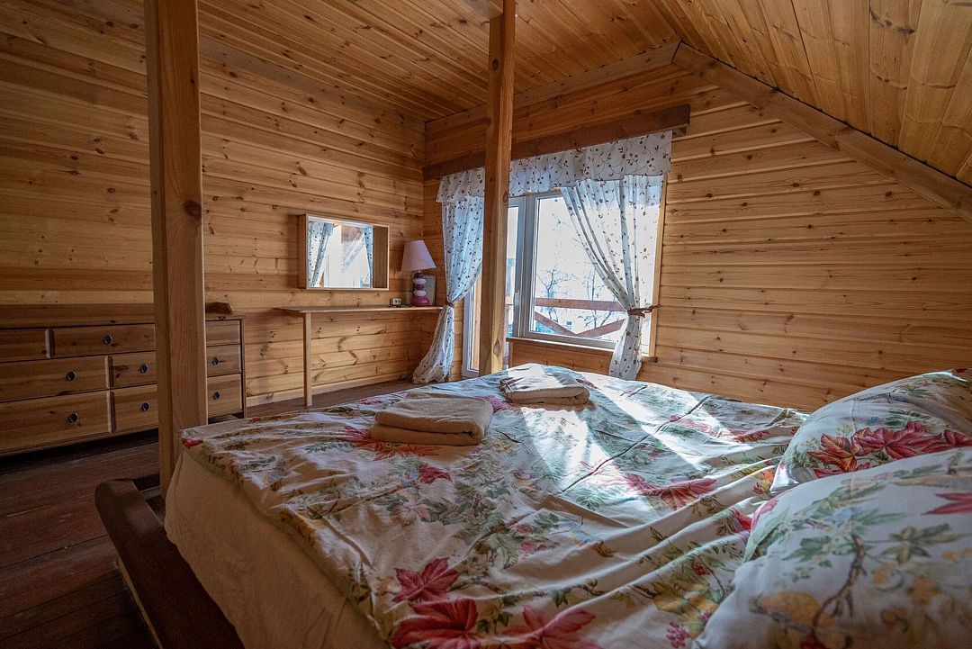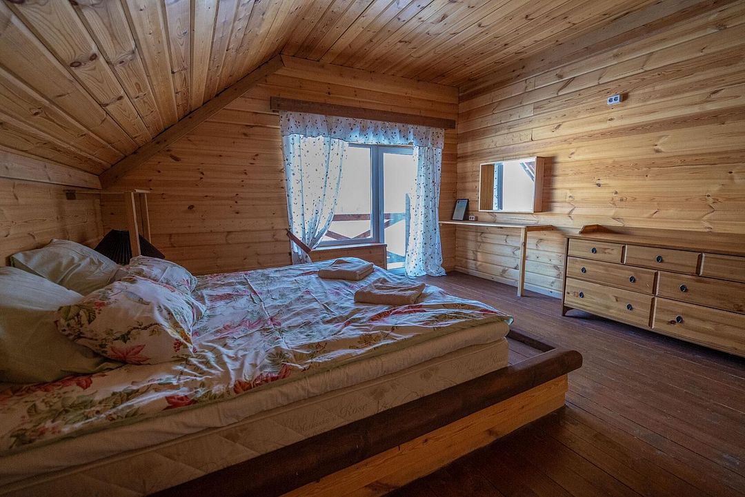 Второй этаж: 4 комнаты с двуспальной кроватью 180 х 200 см, 2 прикроватными лампами, комодом и санузлом (унитаз, умывальник, душ), комплект постельного белья с полотенцами, 2 балкона, цифровое ТВ; мангальная зона с застекленной беседкой и камином.