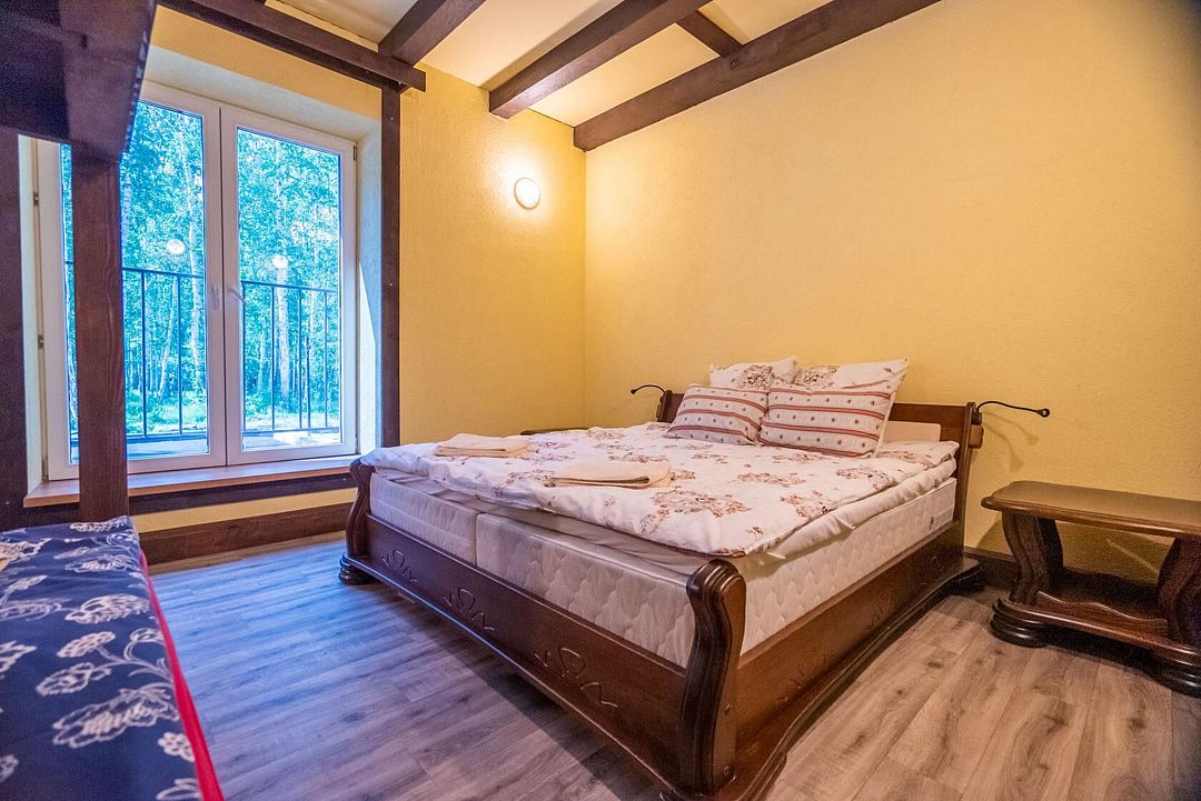 - 2 комнаты с двуспальной кроватью 180 х 200 см., комодом, зеркалом и санузлом (унитаз, умывальник)