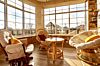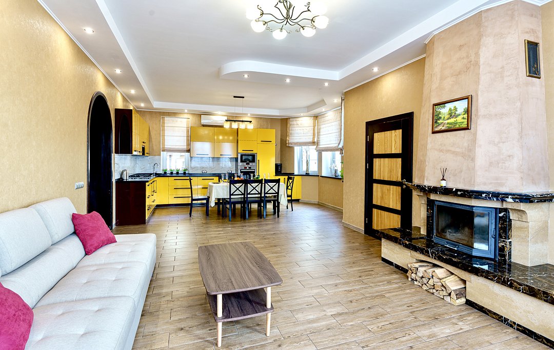 Главный дом: просторная гостиная (40 кв.м) с камином, вместимостью до 14 гостей, полностью оборудованная кухня (посудомойка, кофемашина, духовка, микроволновка), 2 санузла, 4 изолированные спальни (3 с двуспальными кроватями, 1 с большим диваном) + 2 дивана в гостиной.