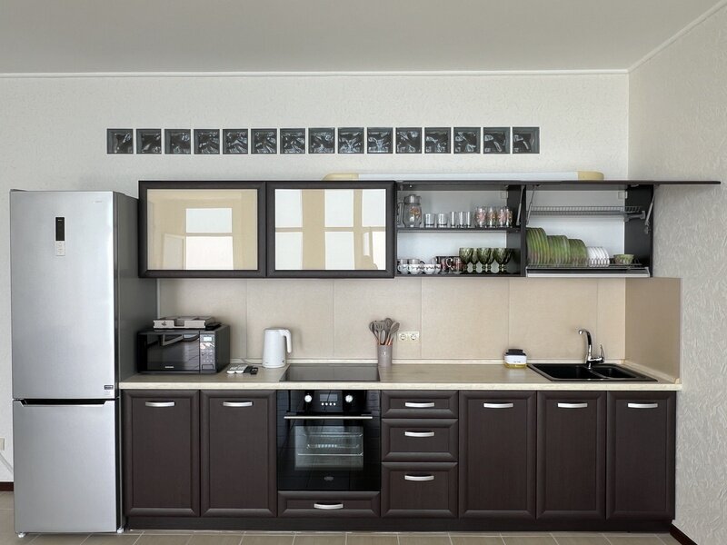 Полностью оборудованная кухня с холодильником, плитой, микроволновой печью, чайником и всем необходимым кухонным инвентарем, включая посуду, кастрюли, сковородки и столовые приборы, для комфортного приготовления пищи.