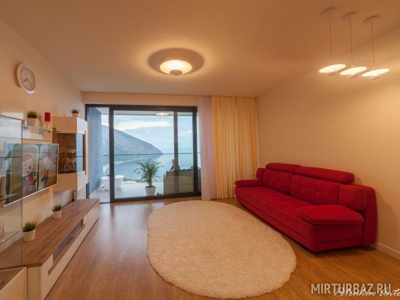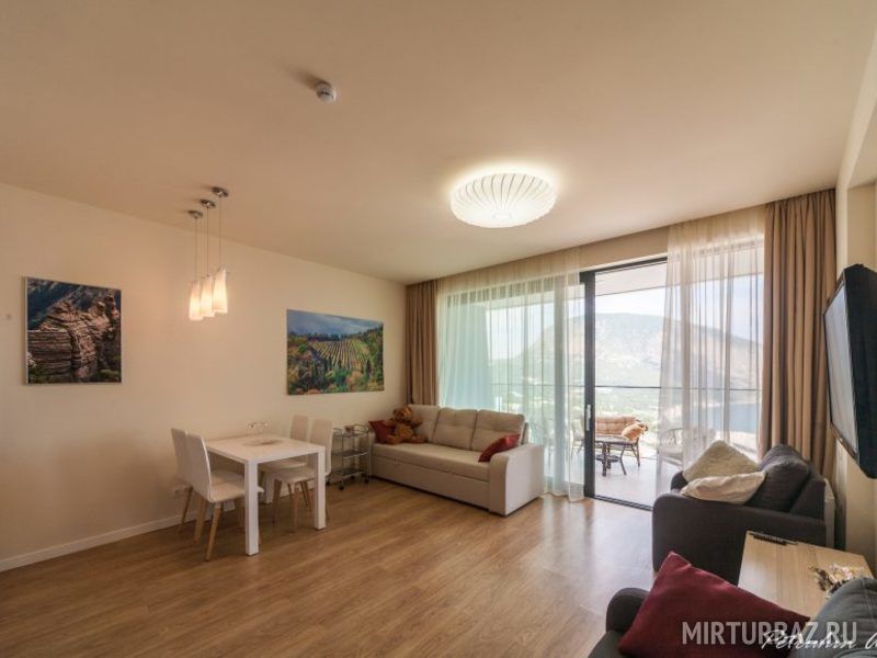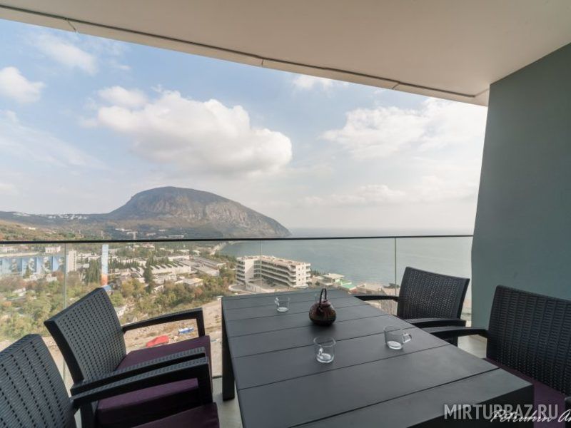 8 этаж. Современные двухкомнатные видовые апартаменты с большой террасой в комплексе Гурзуф Ривьера представляют: одна изолированная спальня, вторая спальня-студио-кухня. Полноценная кухня с полным набором посуды. Сан.узел со стиральной машинкой. Большая видовая терраса с необходимой мебелью, где можно завтракать, обедать, ужинать и наслаждаться видом на Медведь гору, скалы Адалары и черное море. В апартаментах с комфортом может разместиться 4 человека, + 2 доп места. Базовая цена указана за 4ых человек, доп места оплачиваются отдельно.