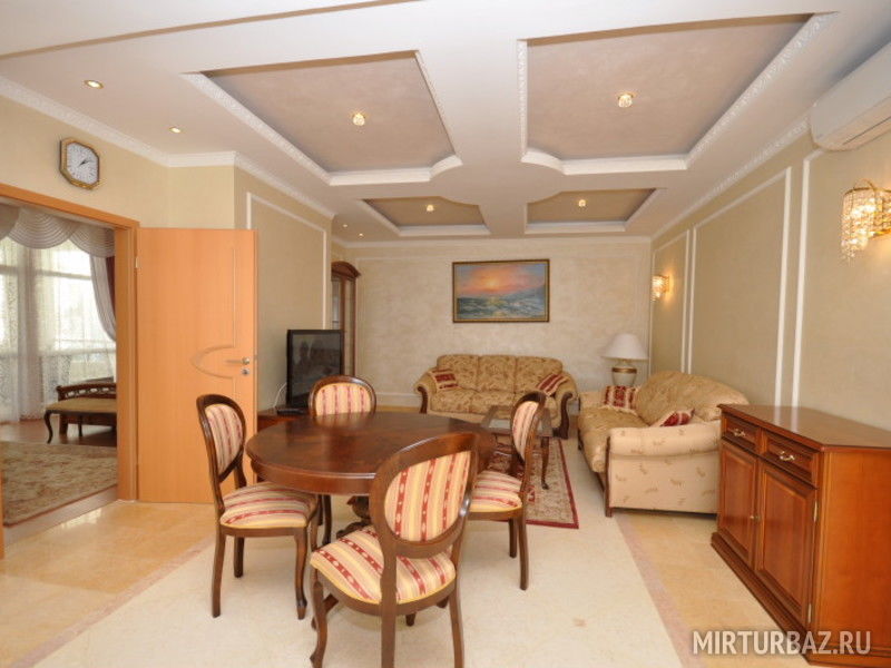 Трехкомнатный номер с двумя спальнями. Номер без балкона, вид в сторону моря. Расположен в комплексе апартаментов на набережной. В номере две просторные спальни и гостевая-студия.