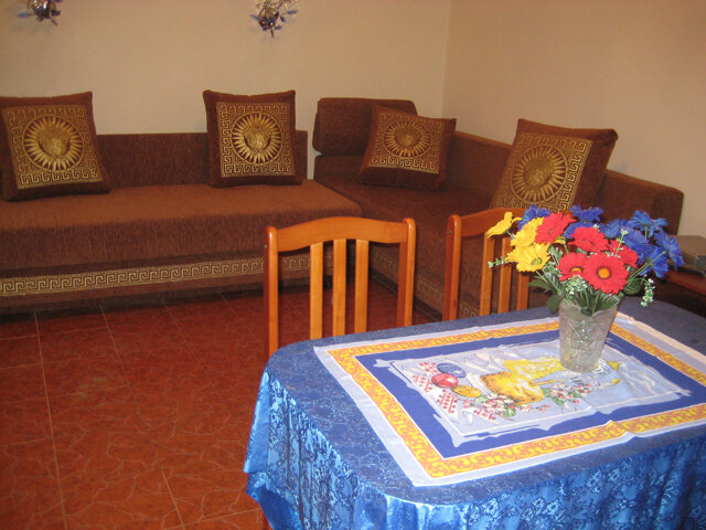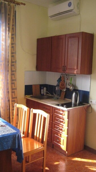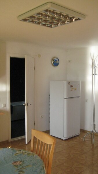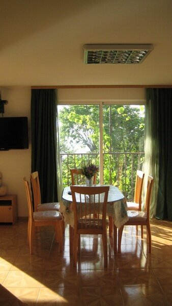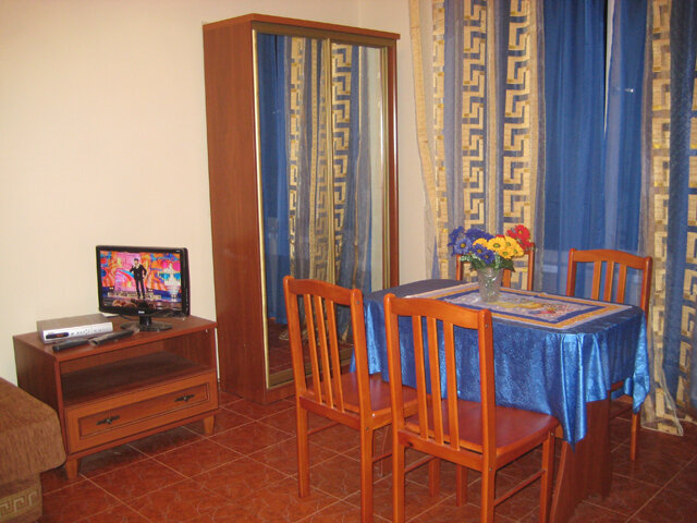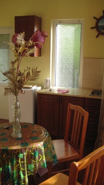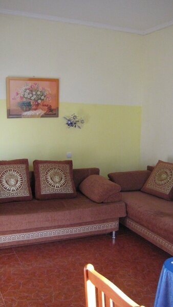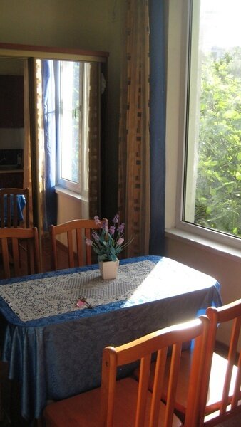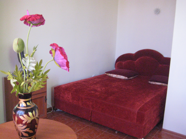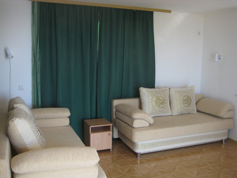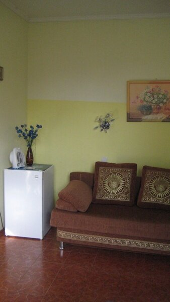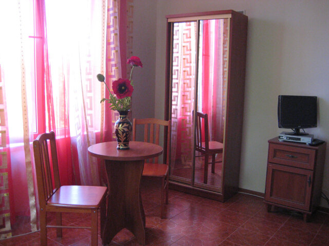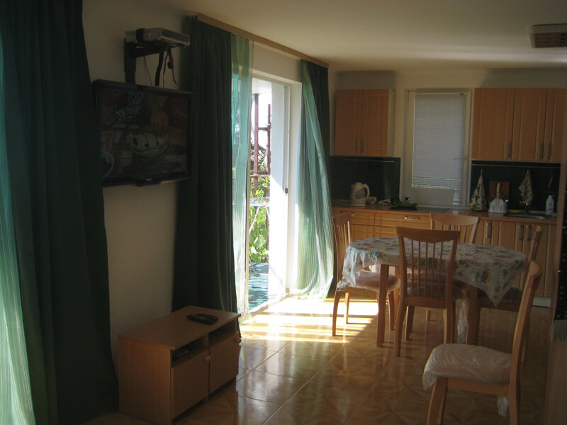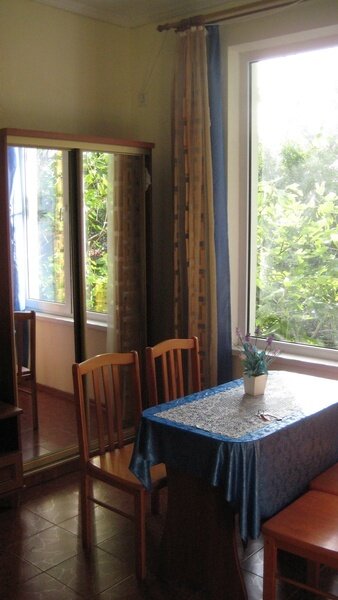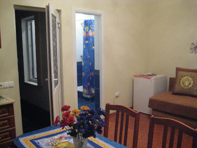 На втором этаже просторный номер «Зеленый» класса «люкс» для большой семьи или компании (40 кв. метров) с тремя двуспальными кроватями, с балконом и хорошим видом на море, просторная ванная комната, стиральная машина, кухня, шкаф, большие зеркала, плазменный телевизор. В каждом номере в наличии телевизор, кондиционер, кухня, душ с горячей водой, санузел. Все чисто, опрятно.