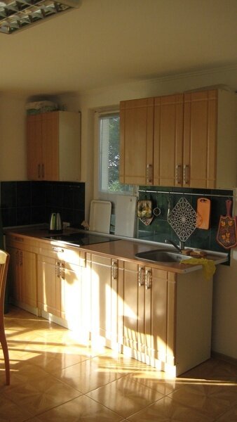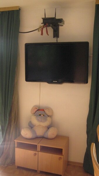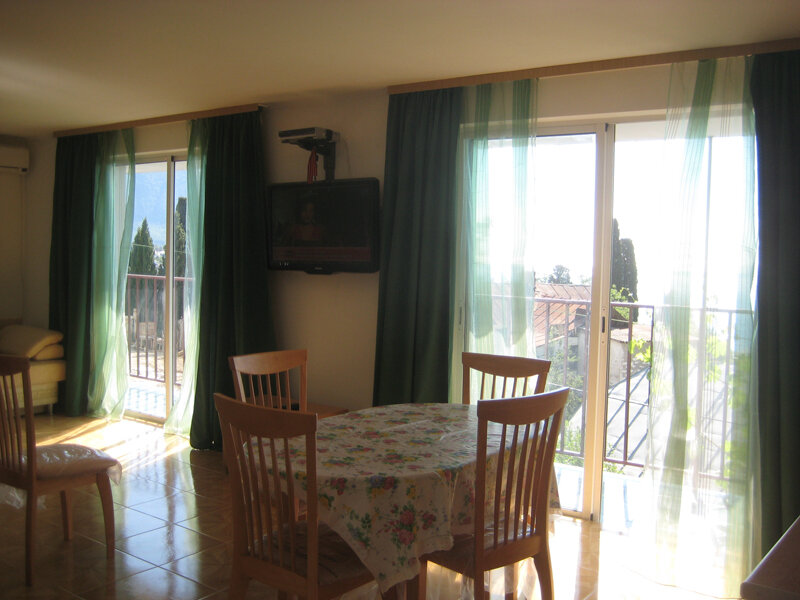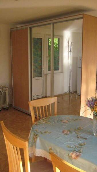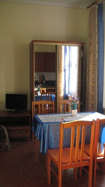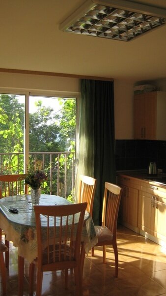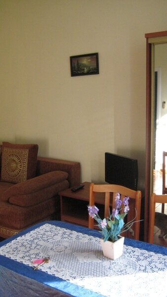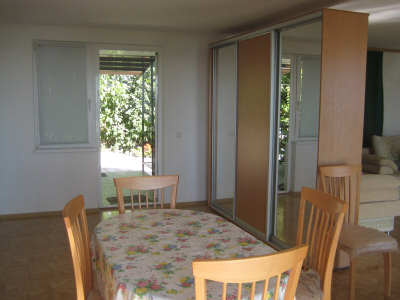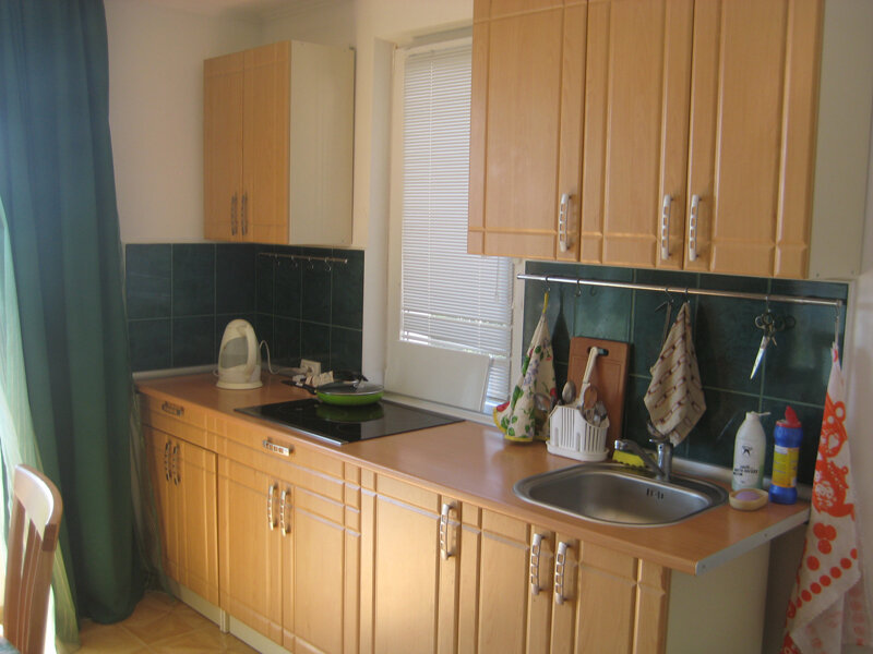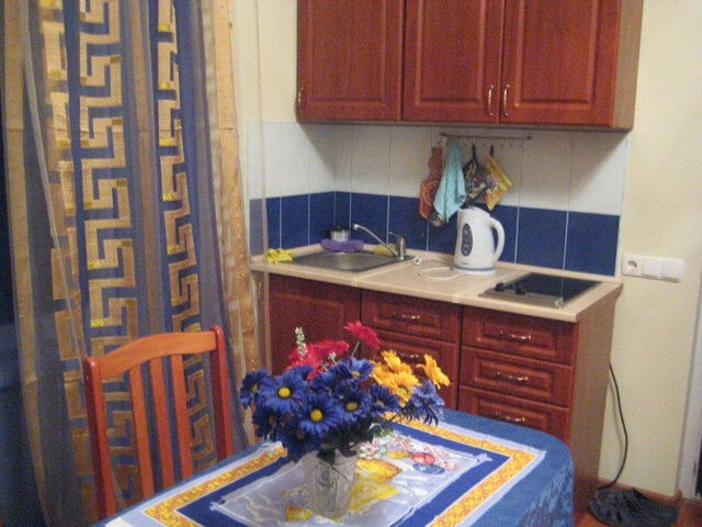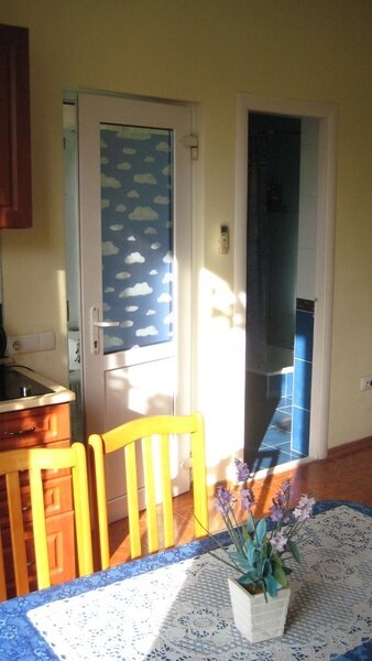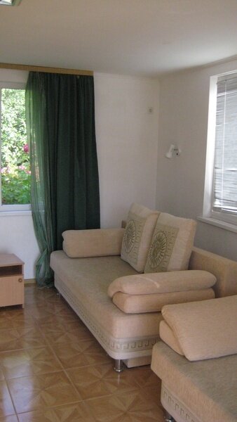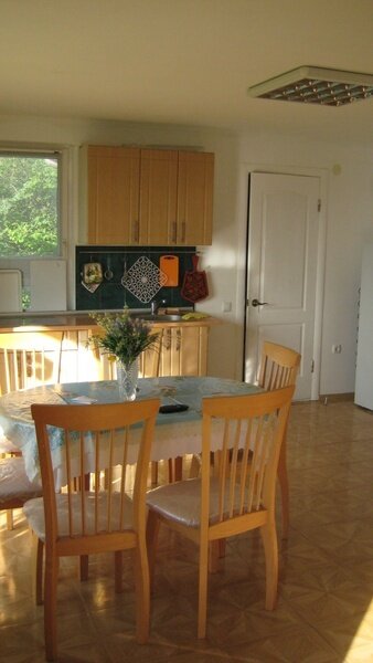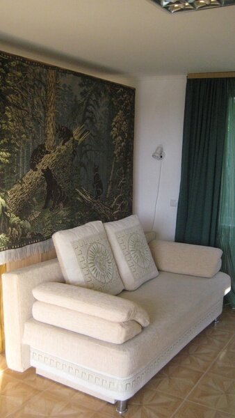 На втором этаже просторный номер «Зеленый» класса «люкс» для большой семьи или компании (40 кв. метров) с тремя двуспальными кроватями, с балконом и хорошим видом на море, просторная ванная комната, стиральная машина, кухня, шкаф, большие зеркала, плазменный телевизор. В каждом номере в наличии телевизор, кондиционер, кухня, душ с горячей водой, санузел. Все чисто, опрятно.