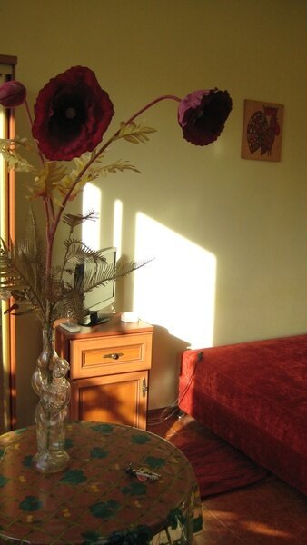 Номер «Красный», выполнен в Красных тонах, на 1 этаже, 20 кв. м с широкой двуспальной кроватью. Вид из окна в сад на инжировое дерево свозь которое проглядывает море. Подходит одиноким людям, молодоженам, семейным парам с маленьким ребенком. Есть возможность поставить дополнительное место. Все удобства.