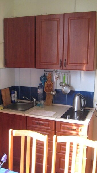 Номер «Синий», выполнен в синих тонах, на 1 этаже, 20 кв. м с двумя раскладывающимися диван-кроватями. Вид из окна в сад на инжировое дерево свозь которое проглядывает море. Подходит одиноким людям, молодоженам, семейным парам с подростком, семейным парам с двумя маленькими детьми. Все удобства.