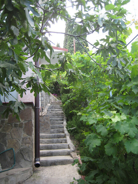 Спустившись к Гурзуфу с трассы, выходите на остановке «Развилка», спускаетесь до моста через речку и направо в гору, все время идете вдоль забора санатория «Гурзуфский», который от вас слева, а когда он кончится, идете вдоль желтой газовой трубы, она выведет вас на Гурзуфское шоссе, поднимаетесь 50 метров по нему к большой белой новостройке, напротив нее зеленые ворота и вывеска – Гурзуфское шоссе, 3.