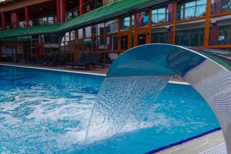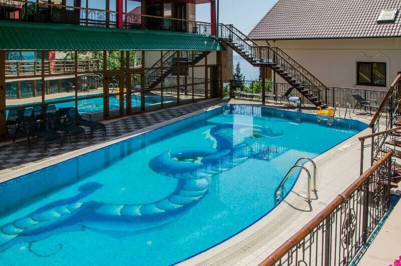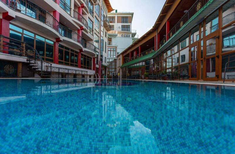 Во дворике гостиницы «Веселый Хотэй» есть большой открытый бассейн с комфортными условиями круглый год. Тут можно насладиться водными процедурами и заказать напитки из ресторана, расслабляясь на шезлонгах. Соблюдается чистота и санитарные нормы.