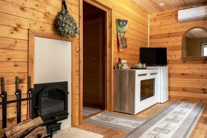 За каждое доп. место — 500 руб.Баня сделана из сосновых пород деревьев. В парилке есть удобные полки.