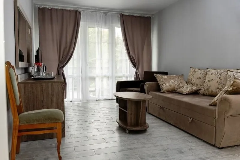 В гостевой зоне размещены мягкий угловой диван, столик, телевизор. Гости могут воспользоваться необходимой посудой и электрическим чайником. Имеется возможность заказать в баре ароматный или травяной чай.
