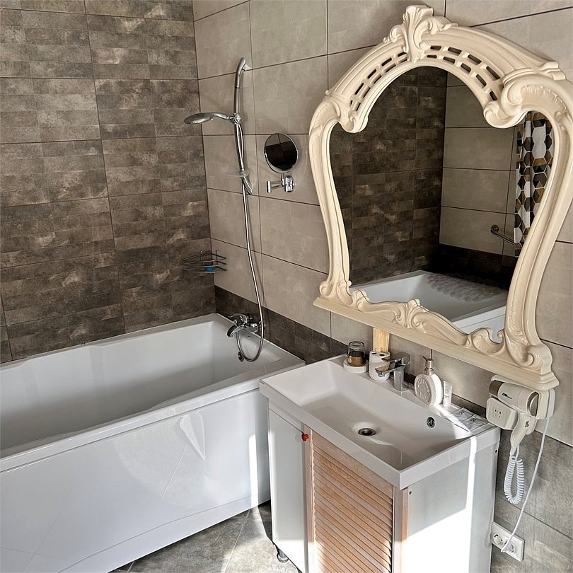 Wi-Fi, кондиционер, светильник, настольные лампы, фен, халаты, тапочки, балкон, двуспальная кровать, тумбы, стулья, шкаф для одежды, журнальный столик, зеркало, пуфики, две комнаты, письменные принадлежности, унитаз, раковина, косметическое зеркало, отопление, душ, плиточное покрытие, высокие потолки, туалетный столик, стол, тумба, туалетный столик, туалетные средства, туалет, диван-кровать, раскладной диван, телевизор с плоским экраном, мини-холодильник, москитная сетка, телевизор со Smart TV, вешалки-плечикиВ номере